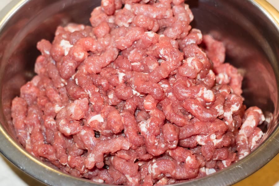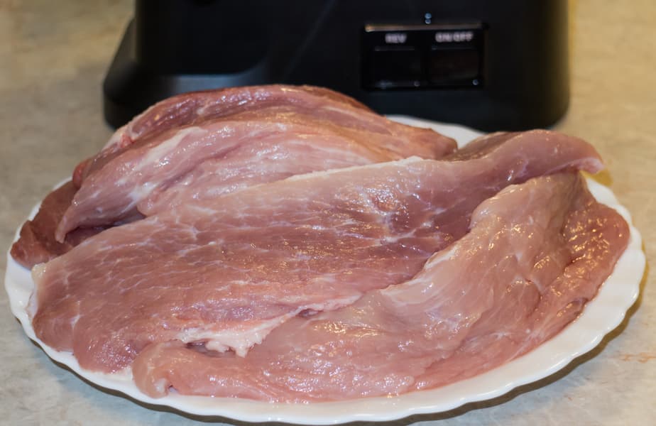 Затем пропустили через мясорубку обрезки с куска свинины.