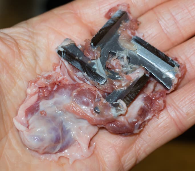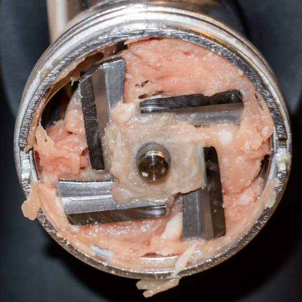 Никаких проблем при помоле этих продуктов не возникло. Фарш шел ровным потоком, решетка не забивалась, скачков мощности или усиленной работы мотора не замечено. После разборки на лезвиях ножа не было непрорезанных жил, некоторое количество их намоталось вокруг вала шнека.