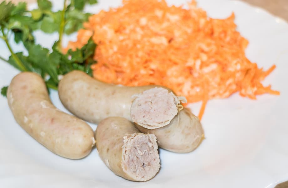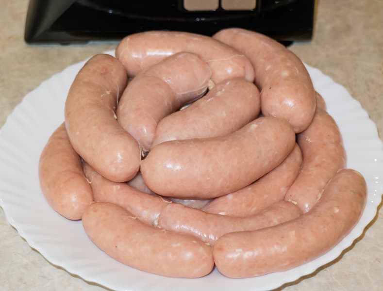 В итоге мы сделали две порции сосисок и одно кольцо сарделек. Чтобы получить небольшие сосиски, мы набивали оболочку неплотно, в процессе сжимали ладонью и распределяли фарш по желаемой длине изделия.