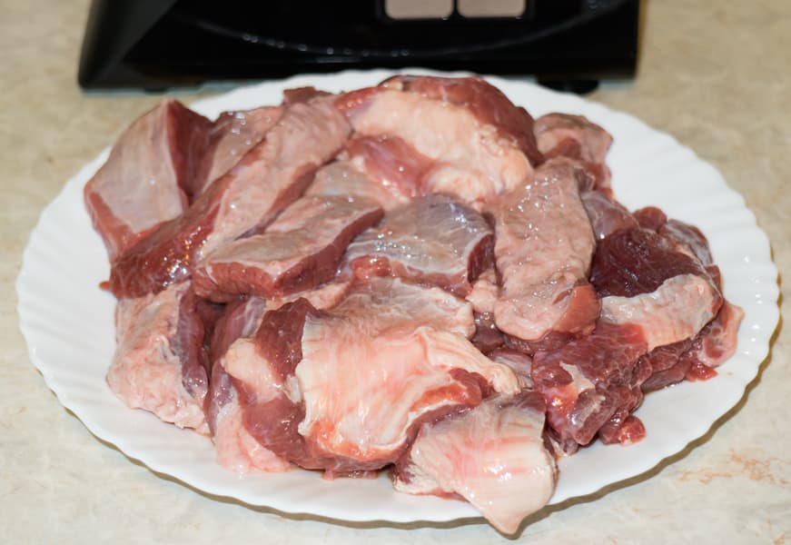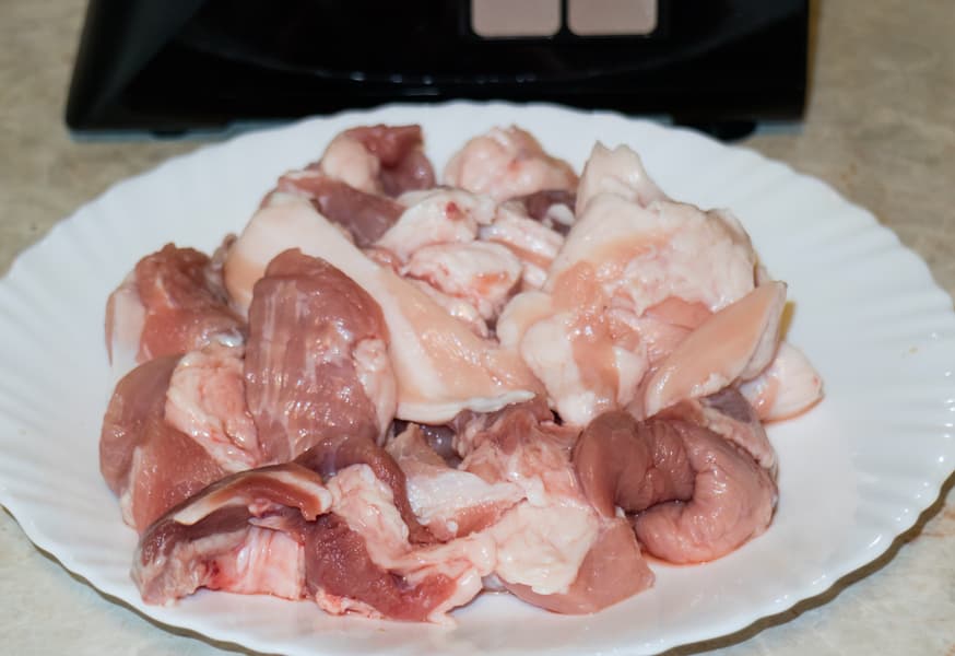 Со свиного окорока удалили жир и жилки, нарезали на кусочки, свободно проходящие в загрузочное отверстие.