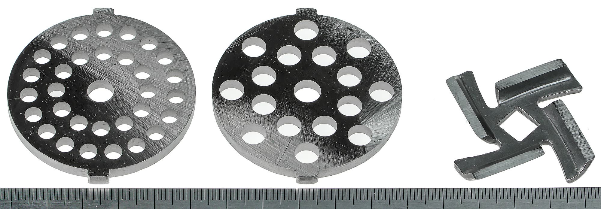 Мясорубка Redmond RMG-1244-6 укомплектована двумя перфорированными дисками: с отверстиями 5 и 7 мм. На наш взгляд, идеальная ситуация, поскольку данные решетки используются наиболее часто. Лезвия ножа острые, так что при мытье и сборке-разборке следует соблюдать определенную осторожность.