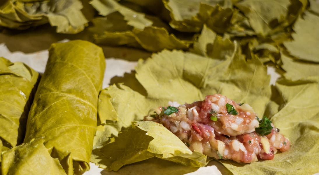Затем мы смешали оба вида фарша, добавили соль, специи, давленый чеснок, предварительно замоченный рис, нарезали большой пучок кинзы и замешали начинку для долмы.