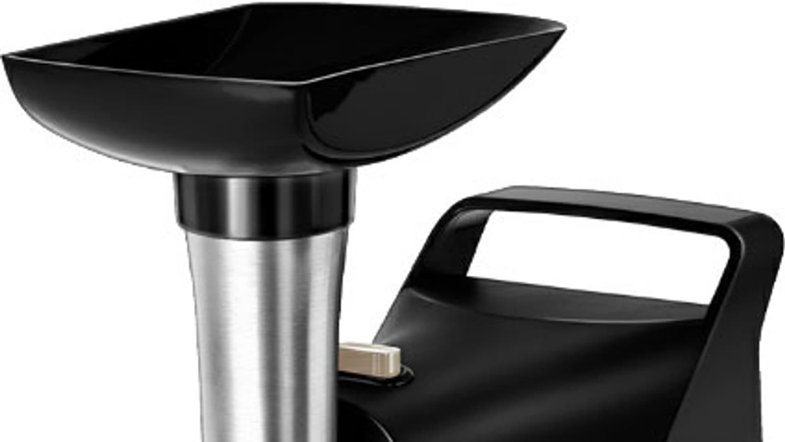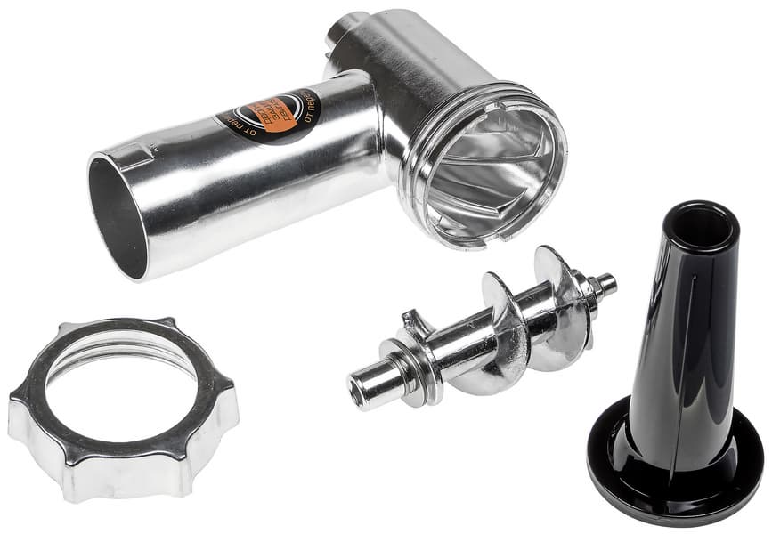 - Загрузочный лоток фиксируется в горловине мясорубки и не вращается вокруг нее, что особенно удобно при изготовлении колбасок или повторном прокручивании фарша.