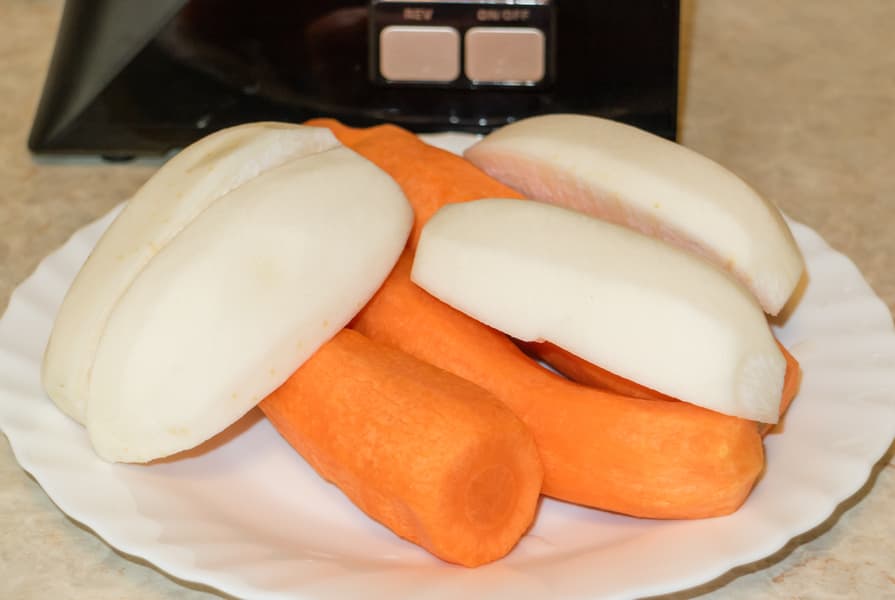 Очистили несколько морковин и одну редьку. Всего вес подготовленных овощей составил 782 г. Закрепили на моторном отсеке насадку-овощерезку, вставили барабан-терку и включили прибор.