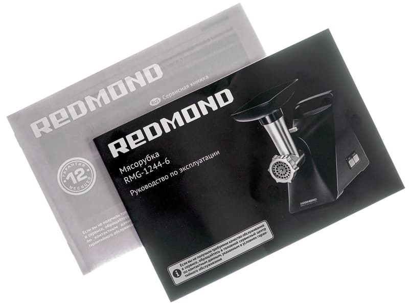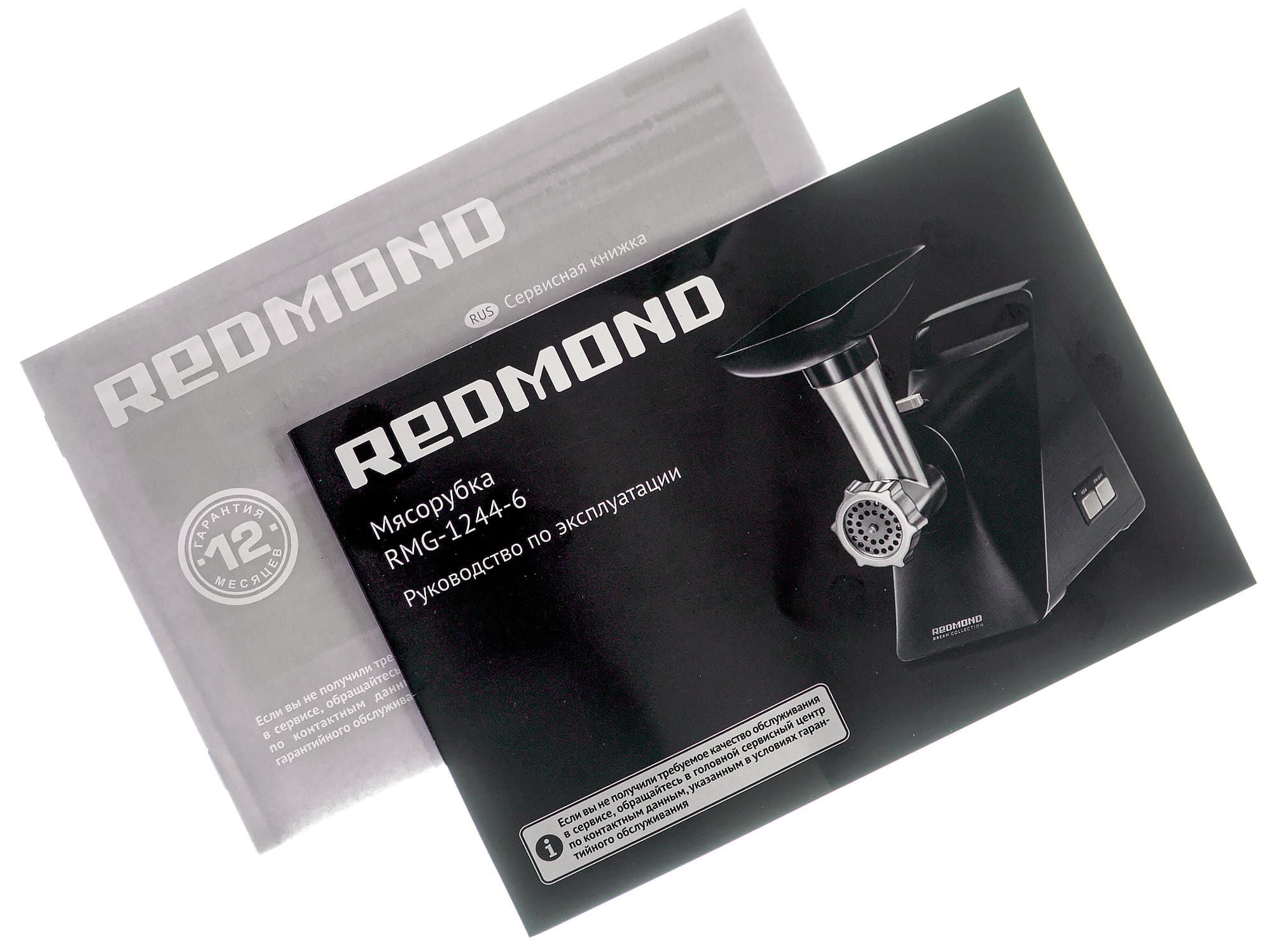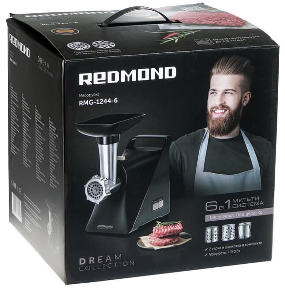 Прибор поступает в продажу в коробке, оформленной в ярком и узнаваемом фирменном стиле. На черном фоне размещены фотографии мясорубки Redmond RMG-1244-6, ее аксессуаров, дано описание характеристик и достоинств. Информация представлена, в основном, на русском и английском языках. Коробка оснащена ручкой для переноски.