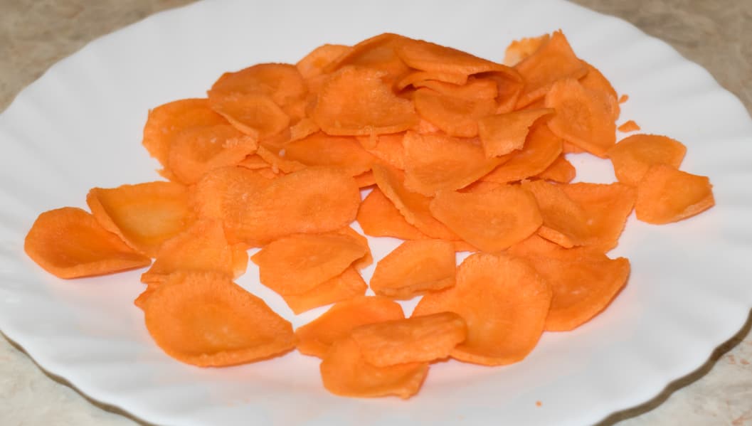 Ломтики морковки получились ровные, почти одинаковой толщины, нарезанных тонко или криво кусочков не так много. Из неприятного отметим лишь то, что под действием центробежной силы некоторые слайсы могут вылетать в стороны за пределы тары, установленной под насадкой.