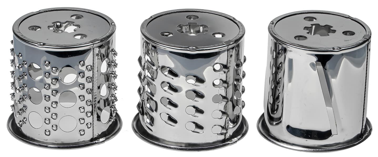 Три стальных барабана позволят нашинковать слайсами и натереть продукты двумя способами — мелко и средне. Режущие кромки очень острые. Собирается насадка несложно: после установки корпуса на моторном блоке нужно вставить внутрь нужный цилиндр, совместив отверстия на его дне с выступами на валу.