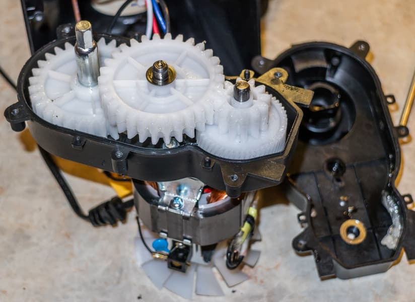Традиционная разборка мясорубки сюрпризов не принесла. Все детали прибора соединяются обычными саморезами с крестовым шлицем. Никаких потайных защёлок не обнаружено. Доступ к шурупам настолько удобный, что вся операция была произведена с помощью шуруповерта.