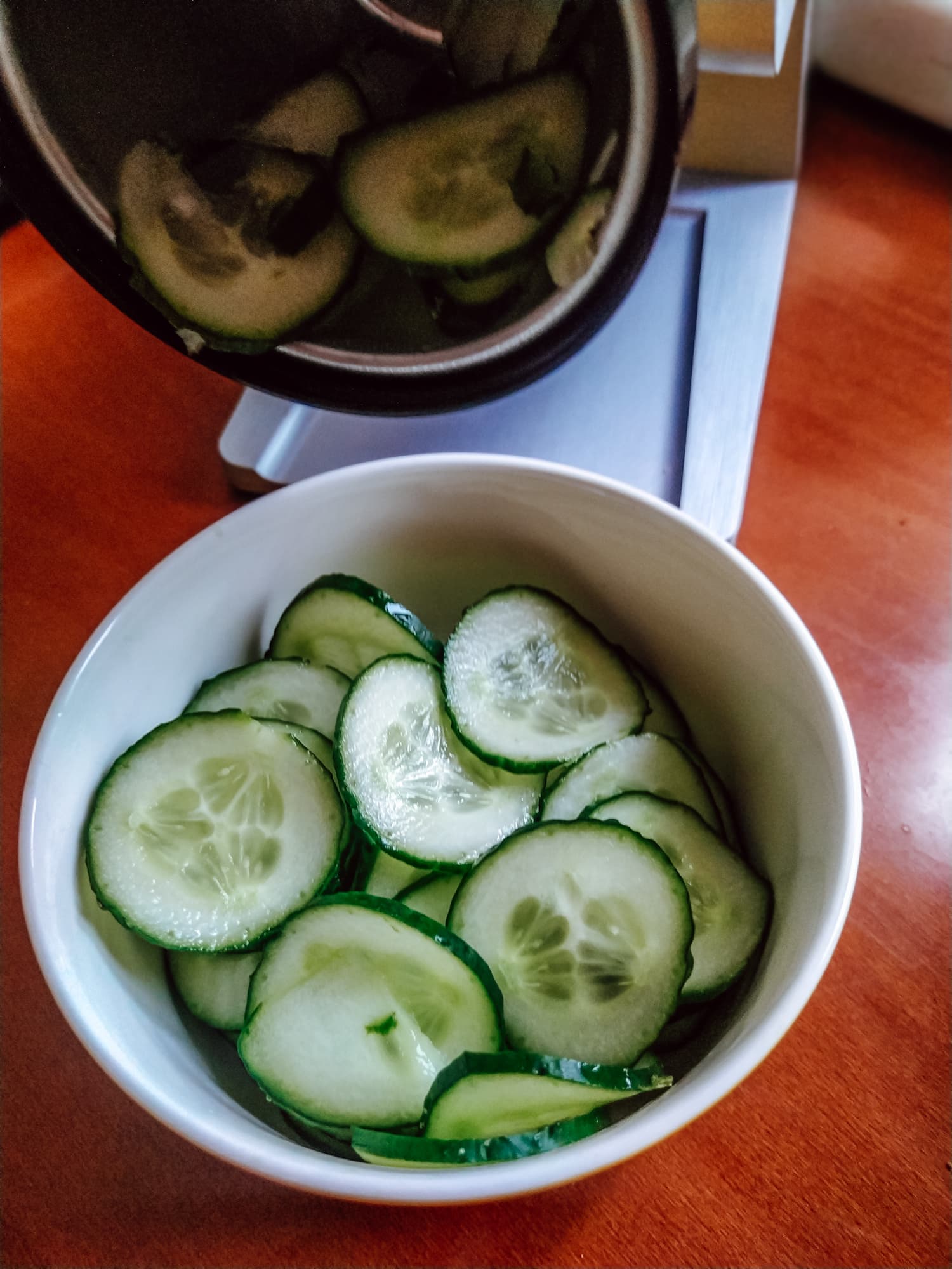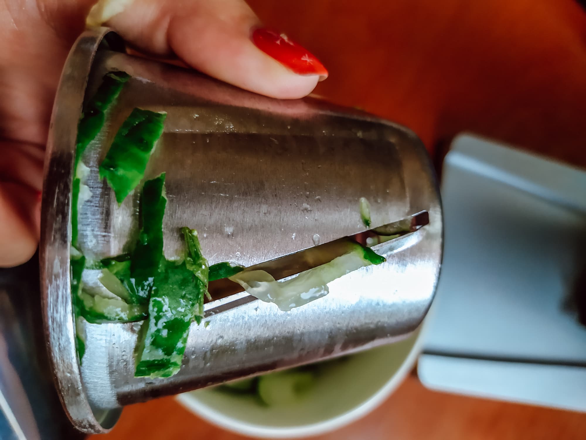 Мы дали шинковке еще один шанс, и с огурцом она справилась на ура. Довольно длинный товарищ был нарезан идеальными тонкими кружками за несколько секунд.