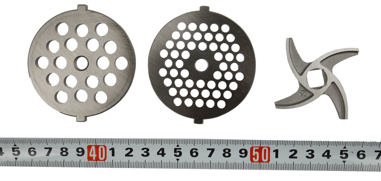 Стальные решетки и нож хорошо заточены. В наборе два формовочных диска: со средними и крупными отверстиями, 5 и 7 мм соответственно.