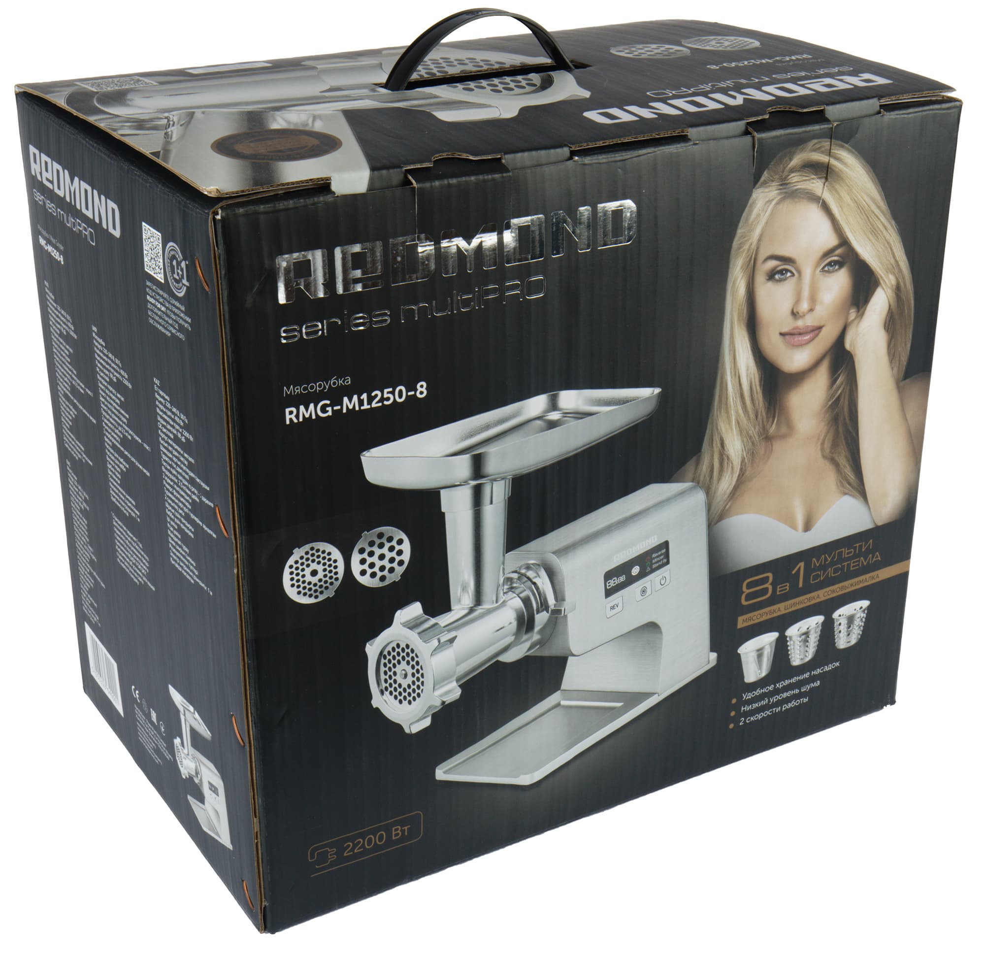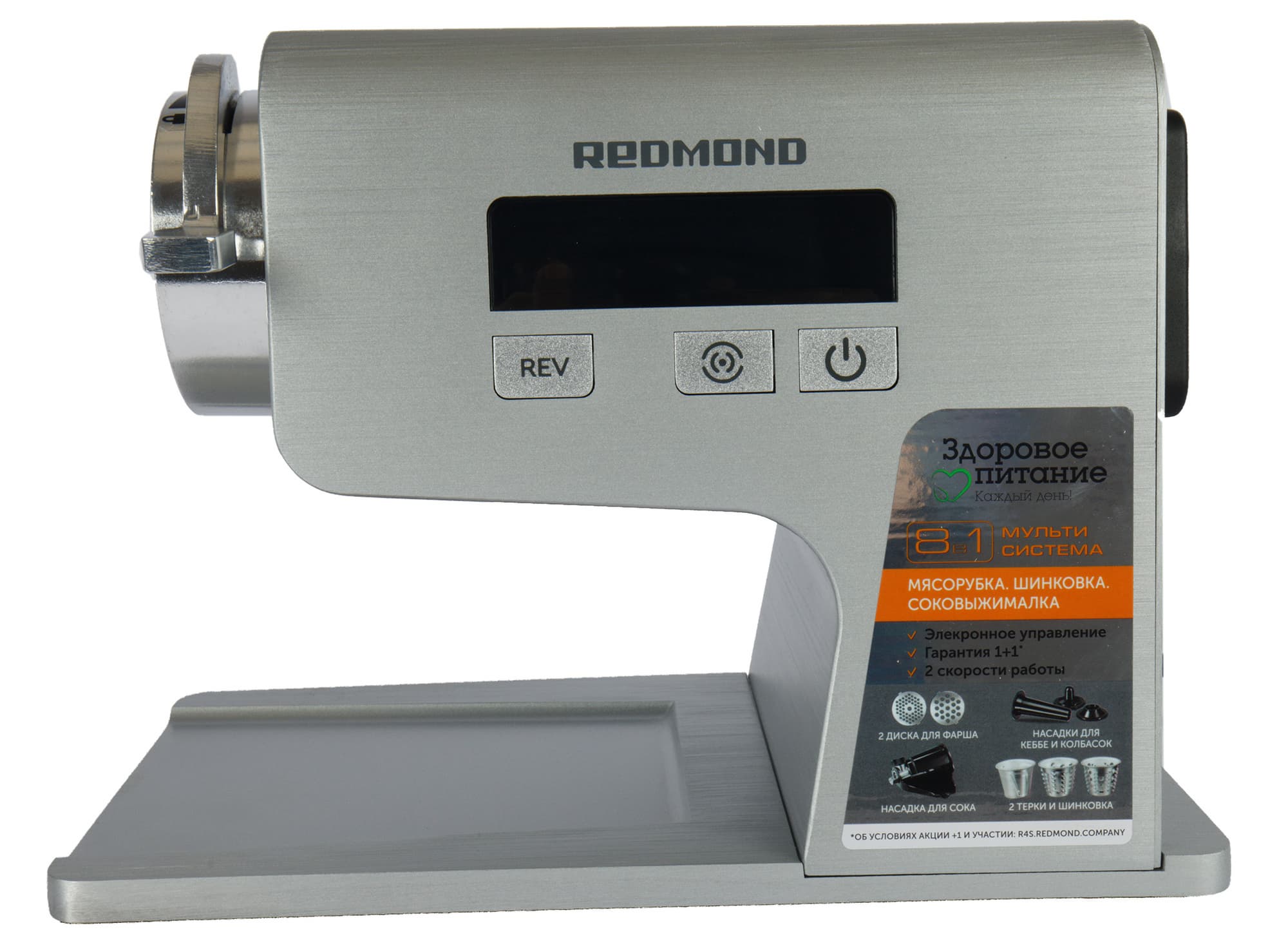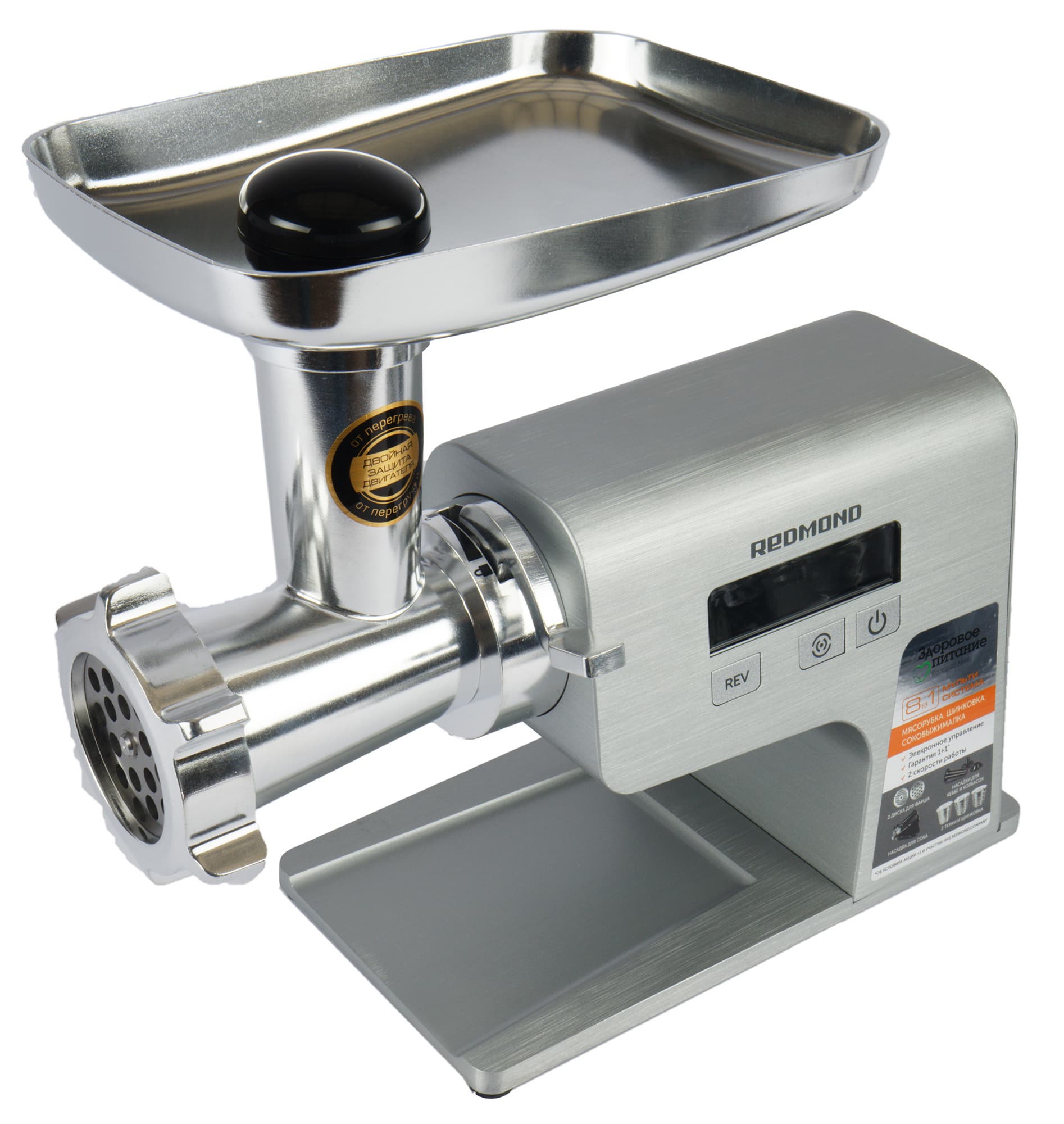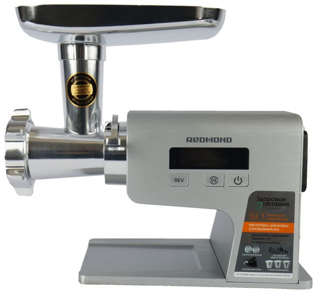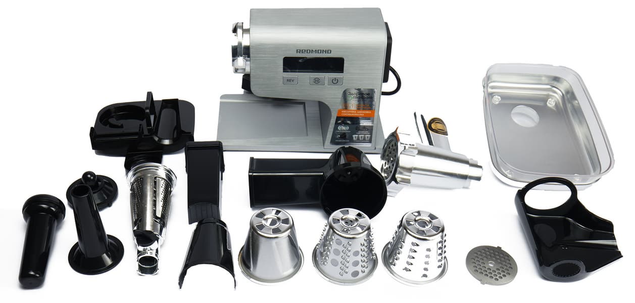 Redmond RMG-M1250-8 — представитель распространенного нынче класса многофункциональных приборов. На коробке значится «8 в 1», на деле же основных функций у прибора три: мясорубка, овощерезка и соковыжималка. Впечатляющую цифру обеспечивают насадки: два формовочных диска мясорубки, насадки для изготовления колбас и кеббе и три терки. Дополнительные функции — отличный повод продать прибор подороже, вот только реализованы они зачастую абы как. Проверим, как поведет себя Redmond RMG-M1250-8 в каждой из трех своих ролей.