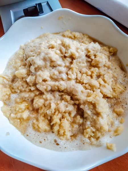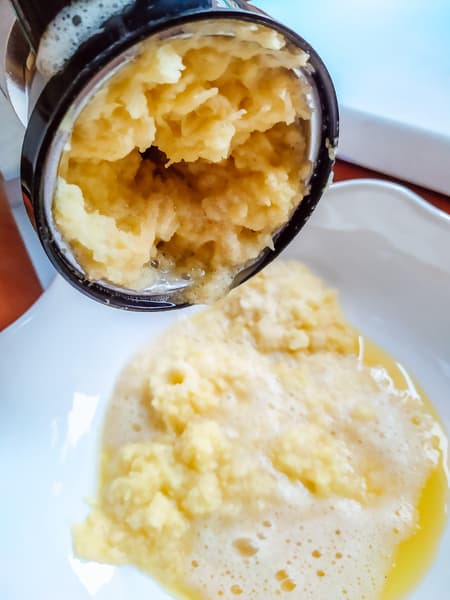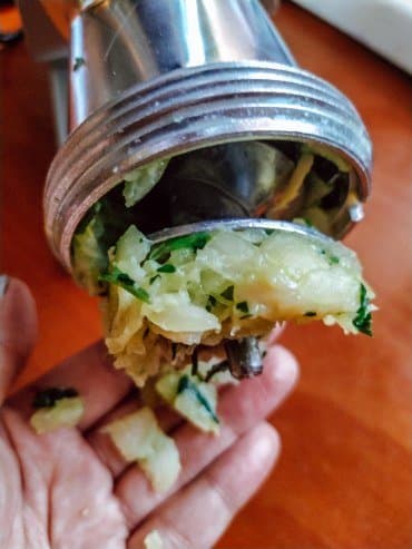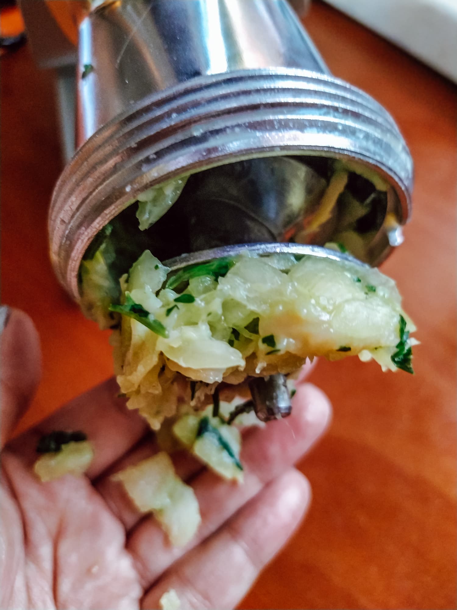 Картофель был истерт почти в пюре, нам осталось лишь слить жидкость и добавить яйца, немного муки и специй.