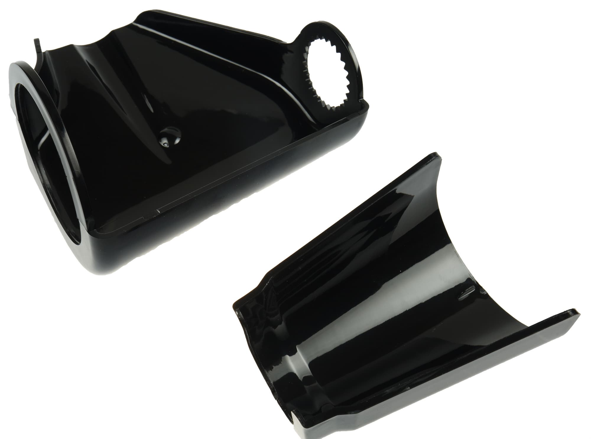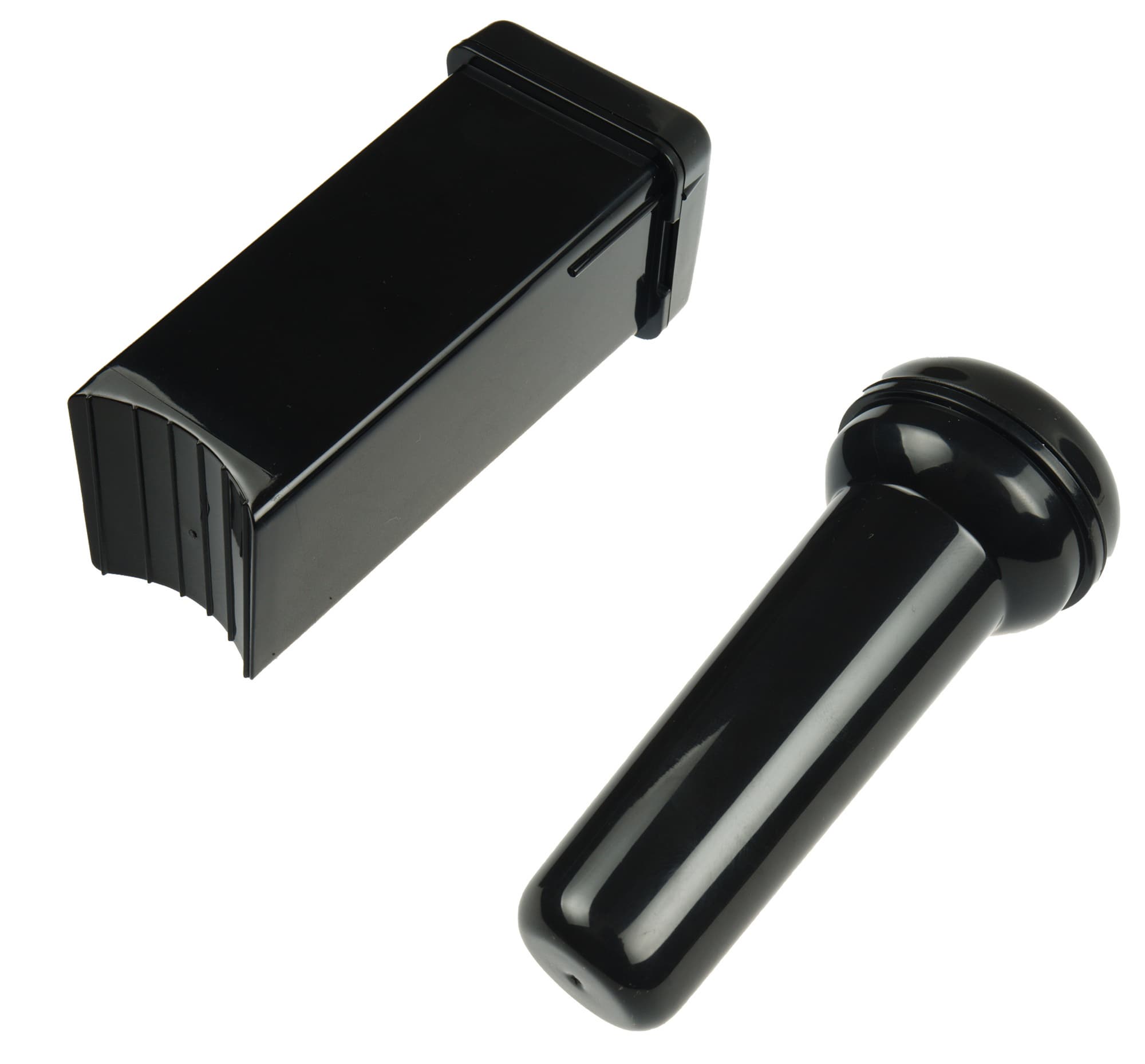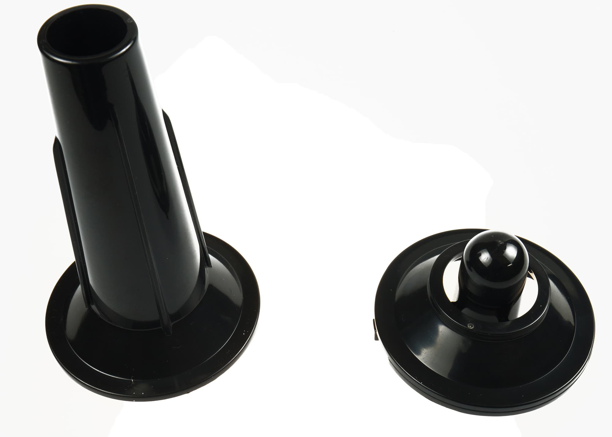Все аксессуары выполнены из черного пластика. Насадки для колбас и кеббе выглядят совершенно стандартно. Толкателей два: один — для мясорубки/соковыжималки, второй — для овощерезки, его можно опускать в горловину в единственном положении.