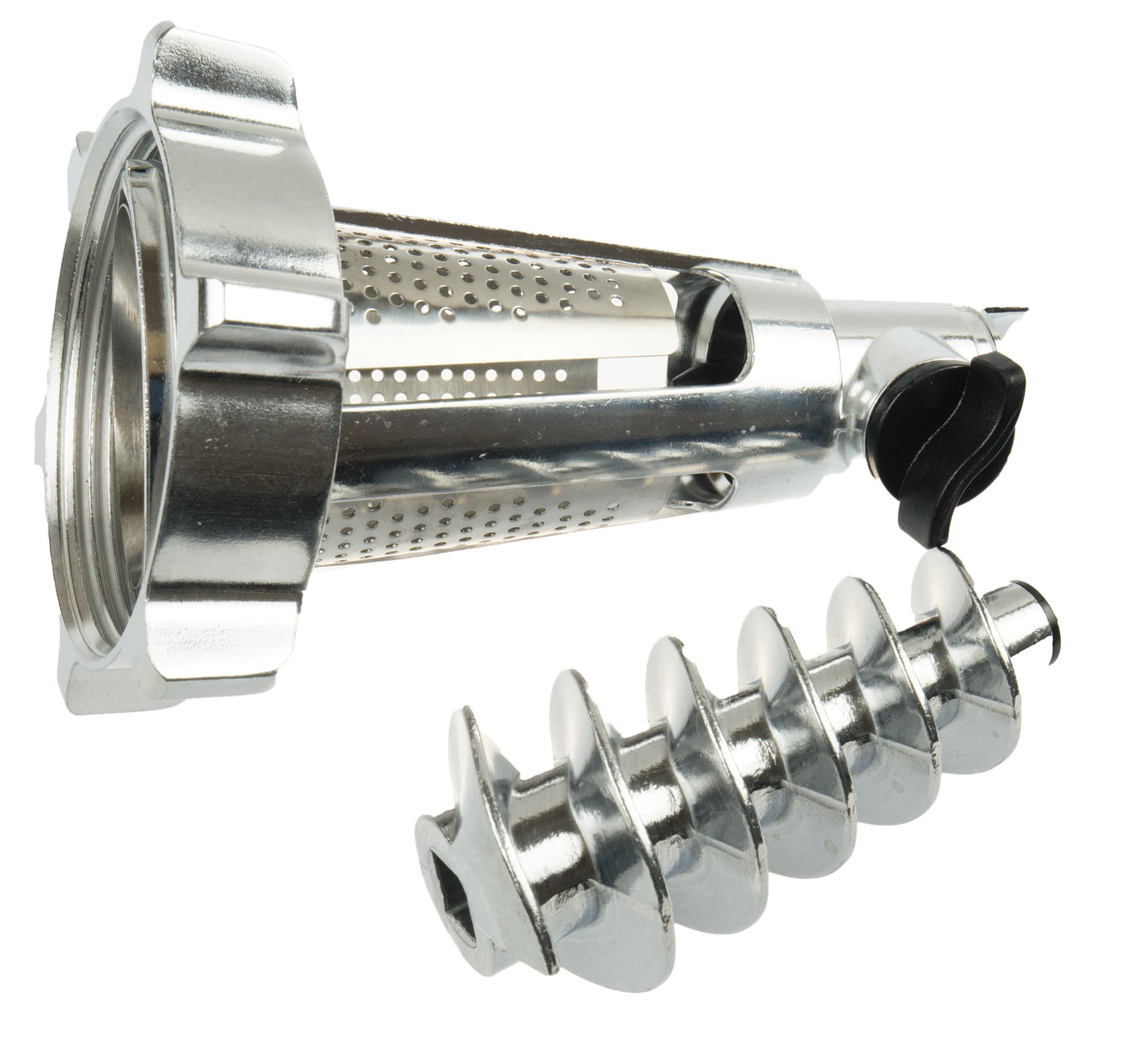 Соковыжималка состоит из дополнительного шнека, блока со съемным фильтром и регулятором выхода жмыха и двух пластиковых деталей: крышки блока и лотка для выхода сока. Регулятор — это широкий пластиковый винт, который вкручивается в специальное отверстие блока перпендикулярно его поверхности. Очевидно, он призван препятствовать выходу жмыха через специальное отверстие.