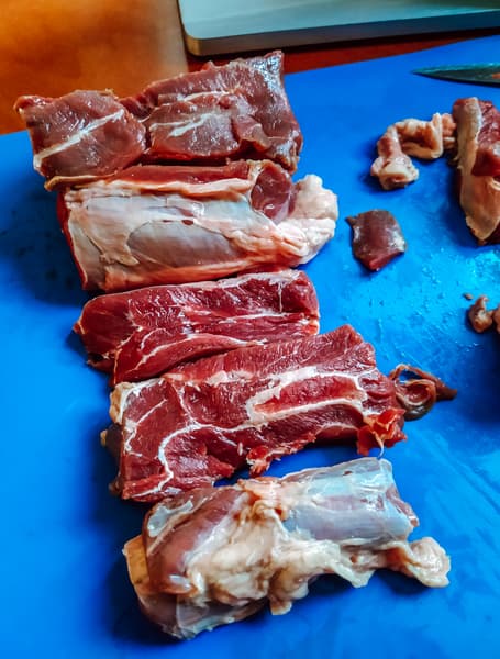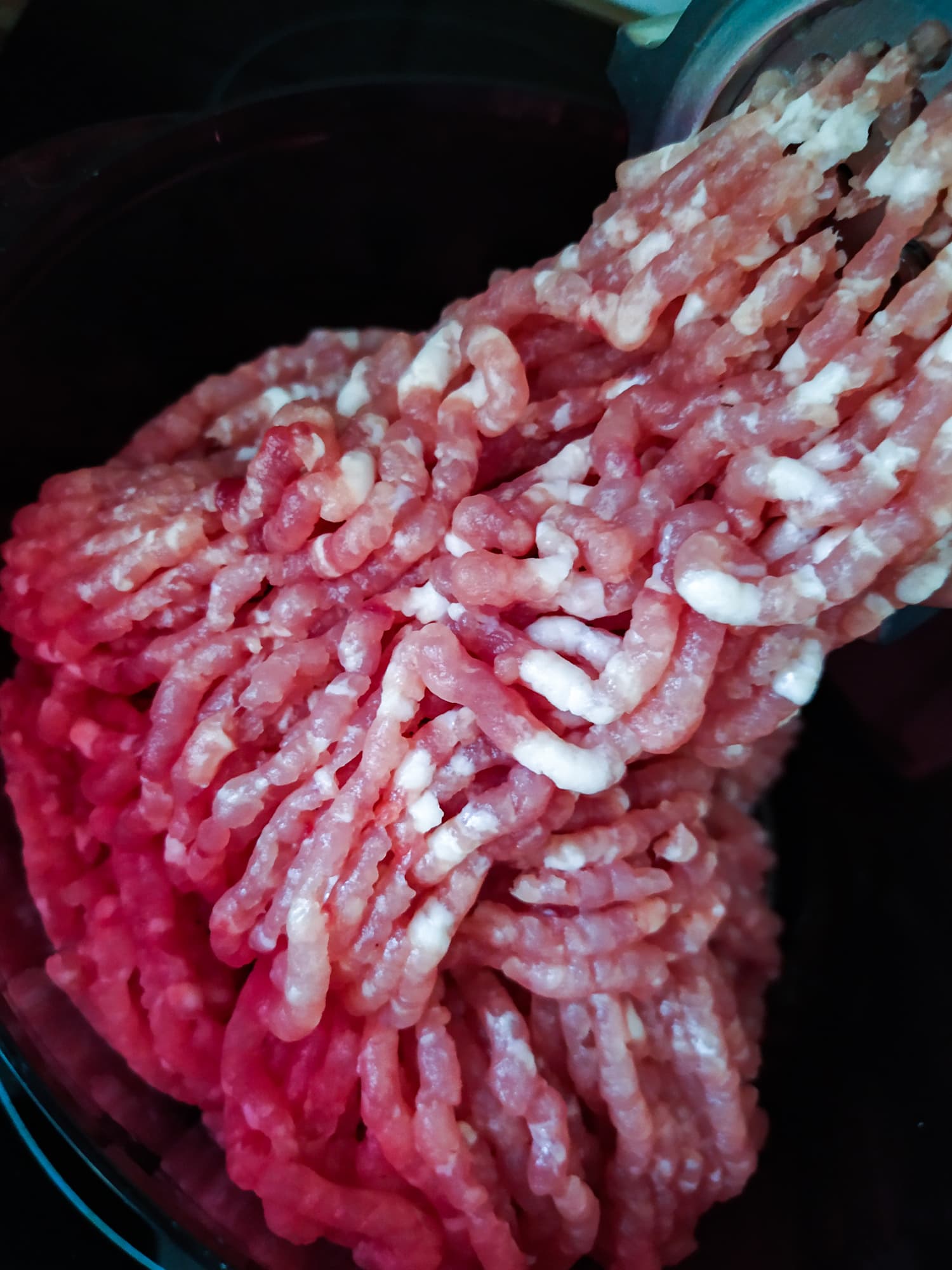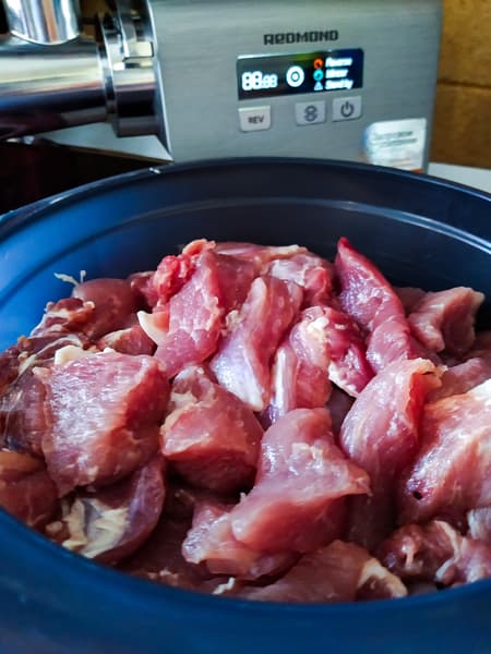 Свинину мы нарезали тонкими полосками, чтобы шнек легче их захватывал.
