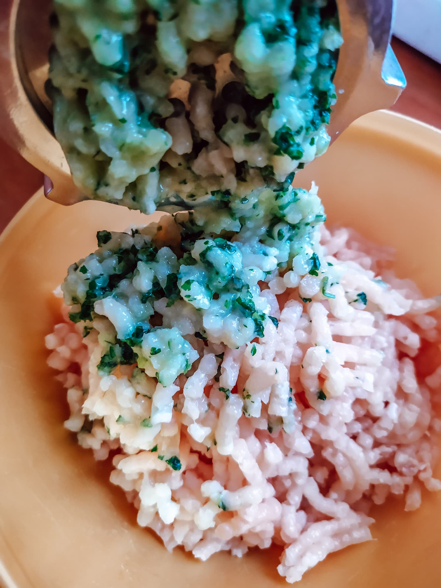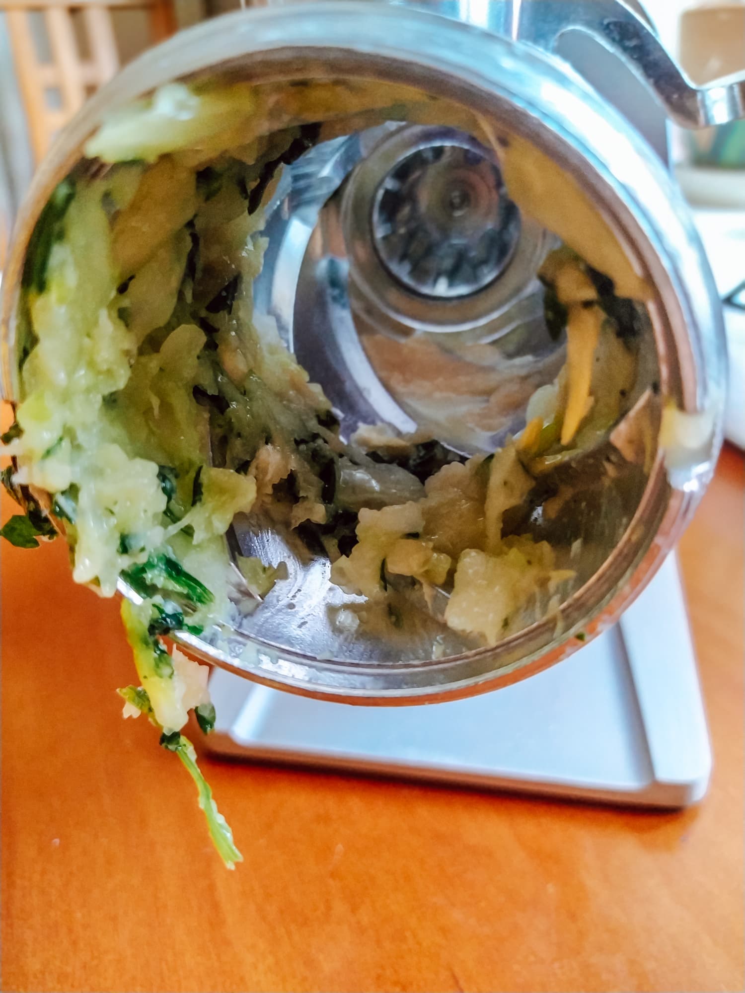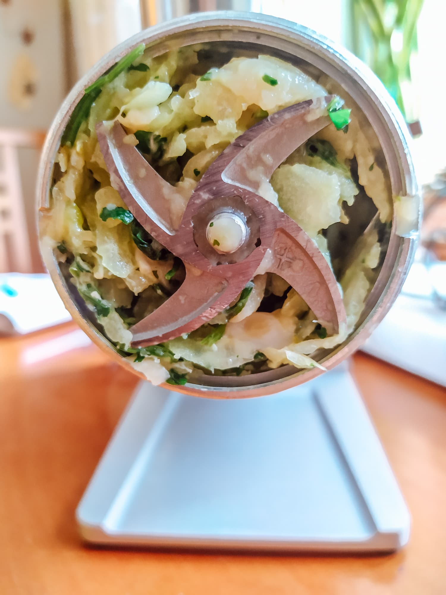 Остатки мяса протолкнули луком и петрушкой. На их измельчение ушло секунд 30.