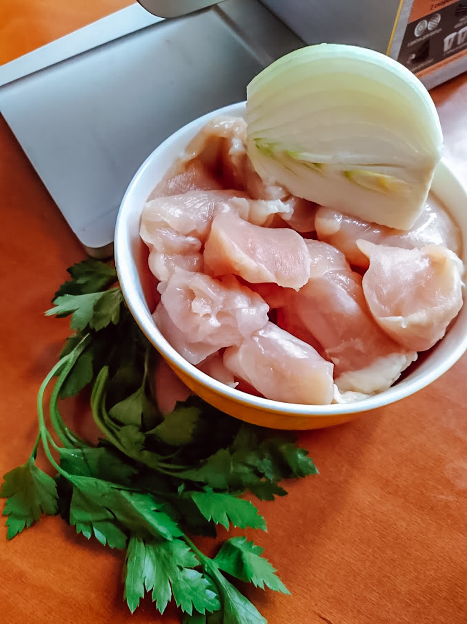 Для разнообразия решили приготовить фарш для куриных котлет. Взяли филе куриной грудки, немного лука и небольшой пучок петрушки.