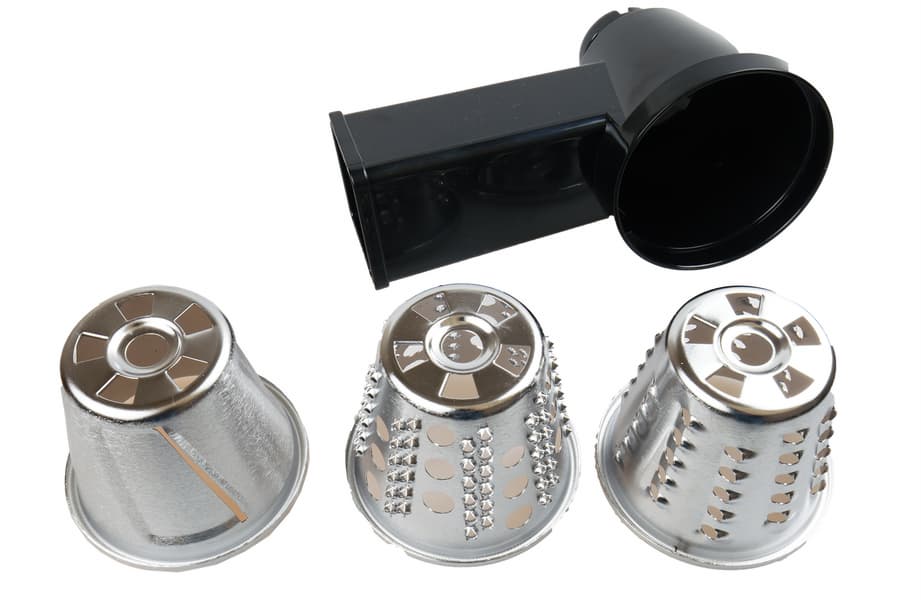 Блок овощерезки выглядит простенько из-за своего черного пластика. К нему прилагаются три насадки: крупная терка, мелкая терка для приготовления пюре и шинковка.