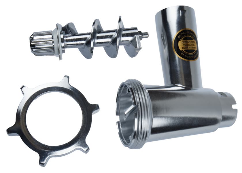 Горловина, шнек и закрепляющая гайка мясорубки выполнены из силумина. Детали хорошо отполированы, нет царапин и зазубрин. Горловина небольшая, труднодоступных для мытья зон нет. Гайка крепко закручивается и легко снимается благодаря покрывающим ее поверхность упорам.