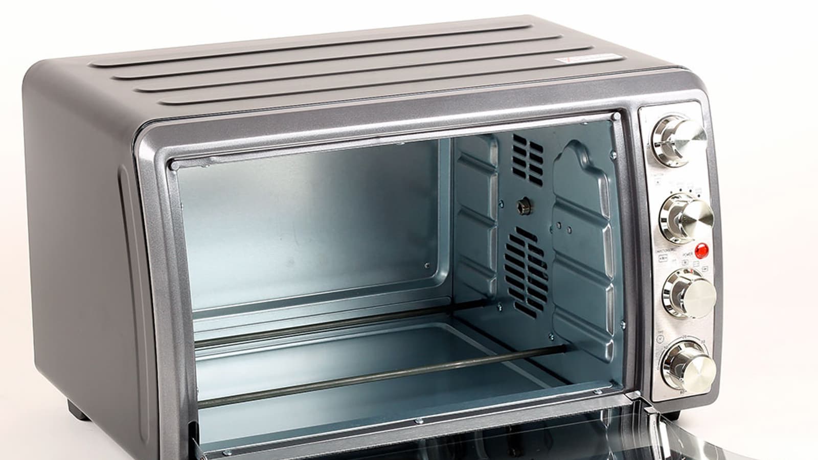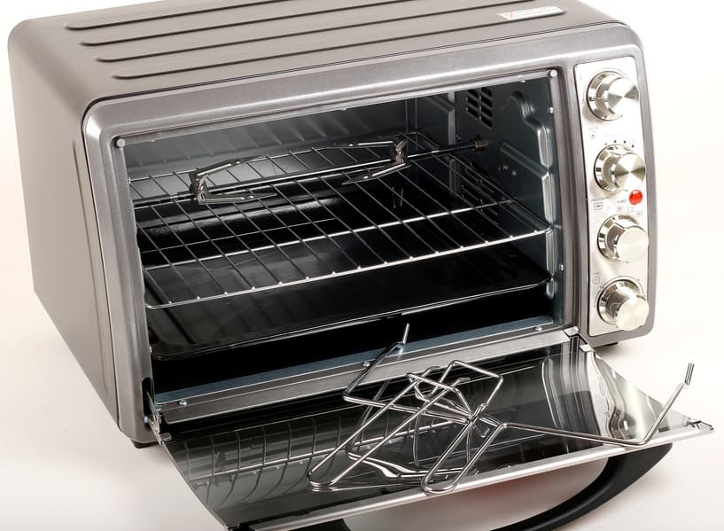 На первый взгляд мини-духовка не такая уж и мини. Внутренняя камера в 32 литра позволит приготовить нормальные порции блюд и запечь мясной пирог внушительного размера. Корпус сделан из окрашенного в черный цвет металла. Лицевая часть выделена темно-серым цветом. Благородной нержавейкой сверкает панель управления с регуляторами и конструктивные элементы стеклянной дверцы. Металл хорошо обработан, качественно и равномерно окрашен, все стыки и соединения деталей гладкие и аккуратные. На правой боковой стороне корпуса видны несколько рядов вентиляционных отверстий.