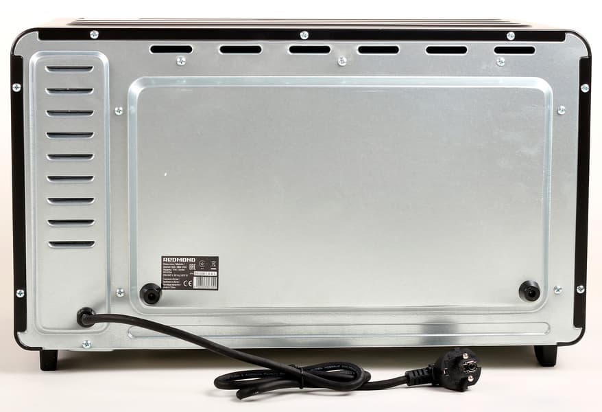 Ряд вентиляционных отверстий расположен также на задней панели печи. Кабель электропитания соединяется с корпусом прибора с правой нижней стороны задней стенки. Здесь же можно увидеть наклейку с технической информацией об устройстве и два пластиковых ограничителя, не позволяющих установить духовую печь вплотную к стене.