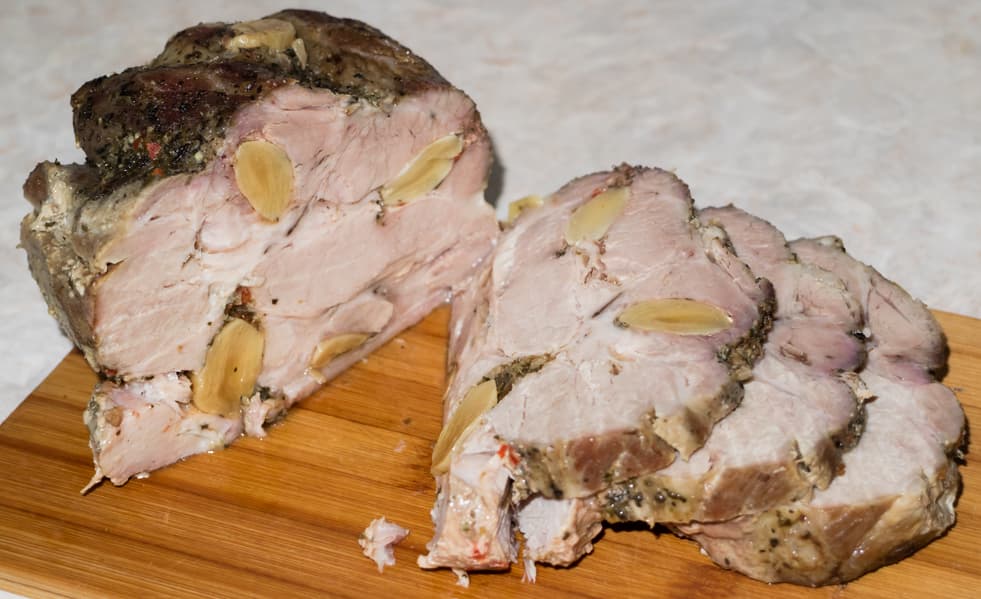 Свинина приобрела красивый поджаренный цвет, изнутри мясо было совершенно готово — мягкое и сочное. Про запах, который заполнил все прилегающие помещения, даже упоминать не будем.