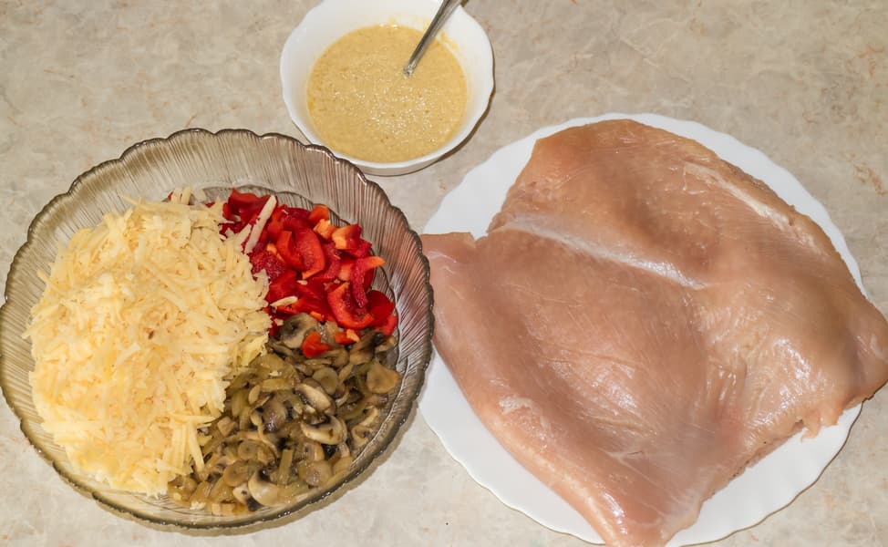 Филе индейки — 1,3 кг, сыр твердый — 200 г, перец болгарский — 180 г, шампиньоны — 120 г, лук зеленый — 40 г, майонез — 40 г, горчица — 35 г, чеснок — 20 г, кунжут — 10 г, вино белое сухое — 100 мл, масло растительное — 50 мл, соль, специи