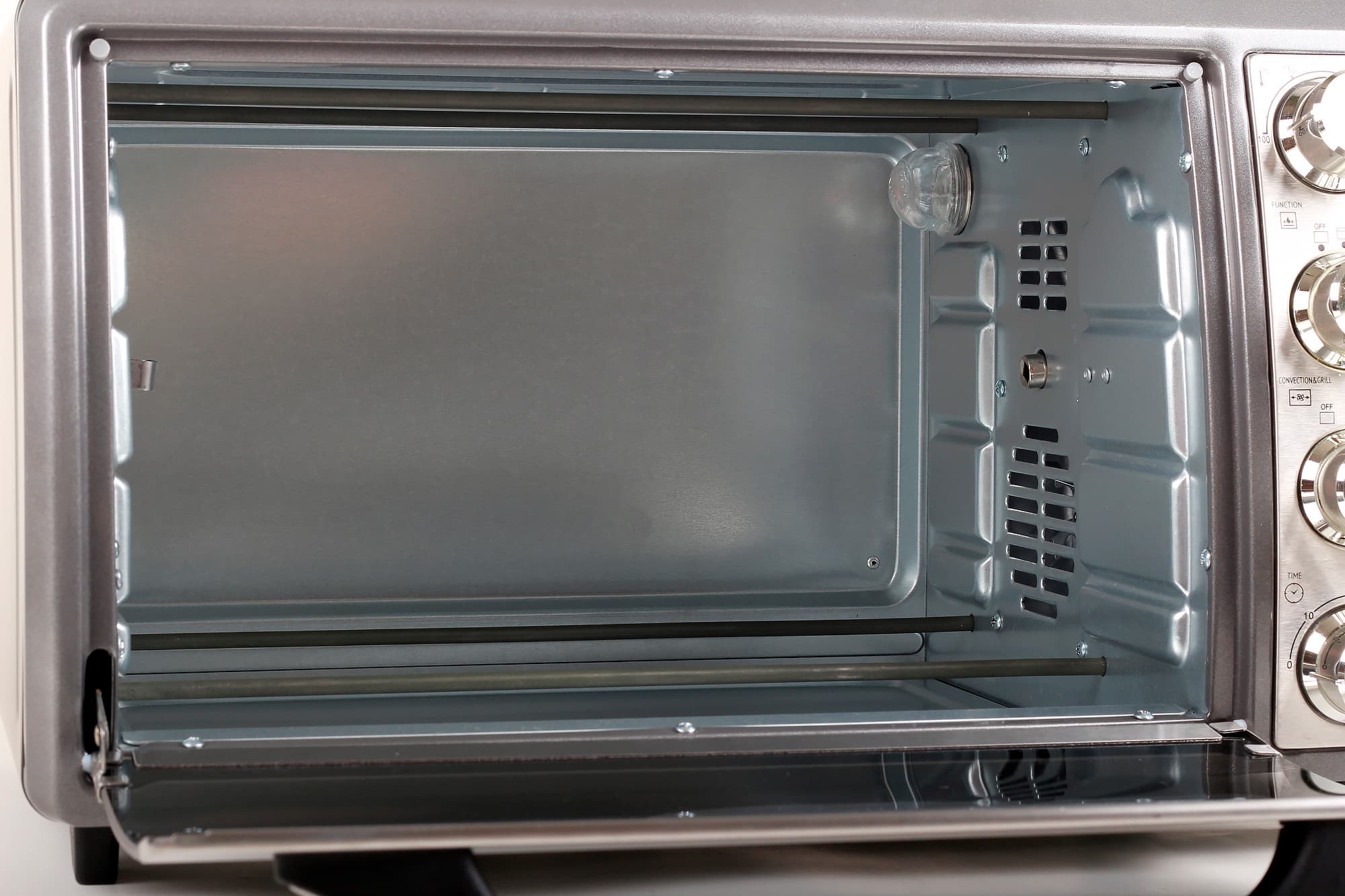 По центру правой боковой стороны находятся паз для установки вертела и горизонтальные отверстия, за которыми «спрятан» вентилятор. В верхнем углу под термостойким колпаком расположена лампочка, освещающая внутреннюю камеру во время работы печи. На левой боковой стороне соответственно расположен упор для вертела.