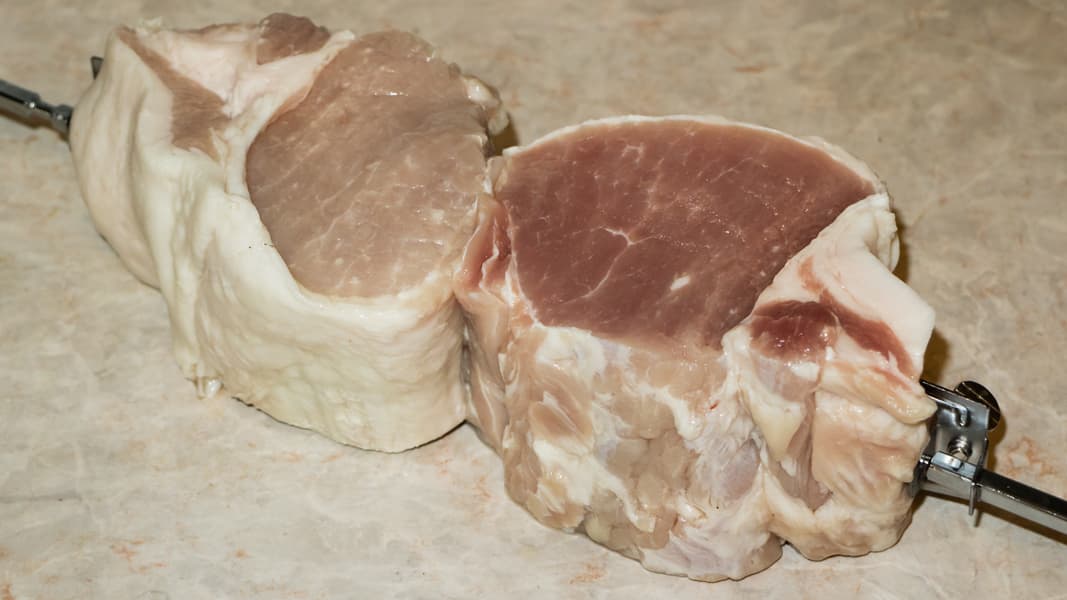 Сначала мы хотели нанизать карбонат на вертел одним куском, но было видно, что в этом случае он расположится неровно — центр тяжести будет смещен. Поэтому разрезали кусок пополам и закрепили на вертеле.