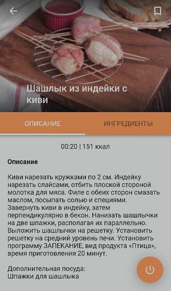 В каждом рецепте приведено время приготовления и калорийность блюда. Само окно содержит две вкладки: описание и ингредиенты. Запустить процесс приготовления можно прямо из самого рецепта, не переходя во вкладку главного меню «Программы».