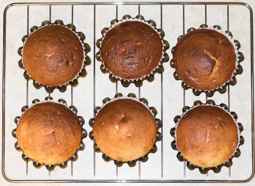 Творожные кексы, спустя 35 минут выпечки, остались, на наш вкус, слишком светлыми, хотя внутри были готовы — зубочистка выходила совершенно сухой. За 5 добавленных минут на 200 °C поверхность подрумянилась.