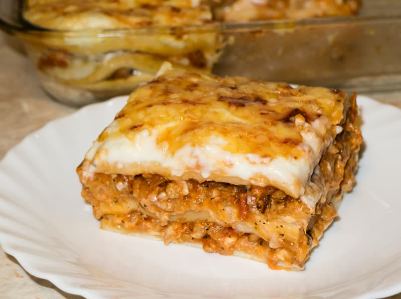 Накрыли вторым слоем теста. Повторили операцию: смазали Бешамель, выложили остатки мясной начинки. Завершили сборку последним слоем теста и выкладыванием остатков белого соуса поверх. Посыпали натертым твердым сыром.