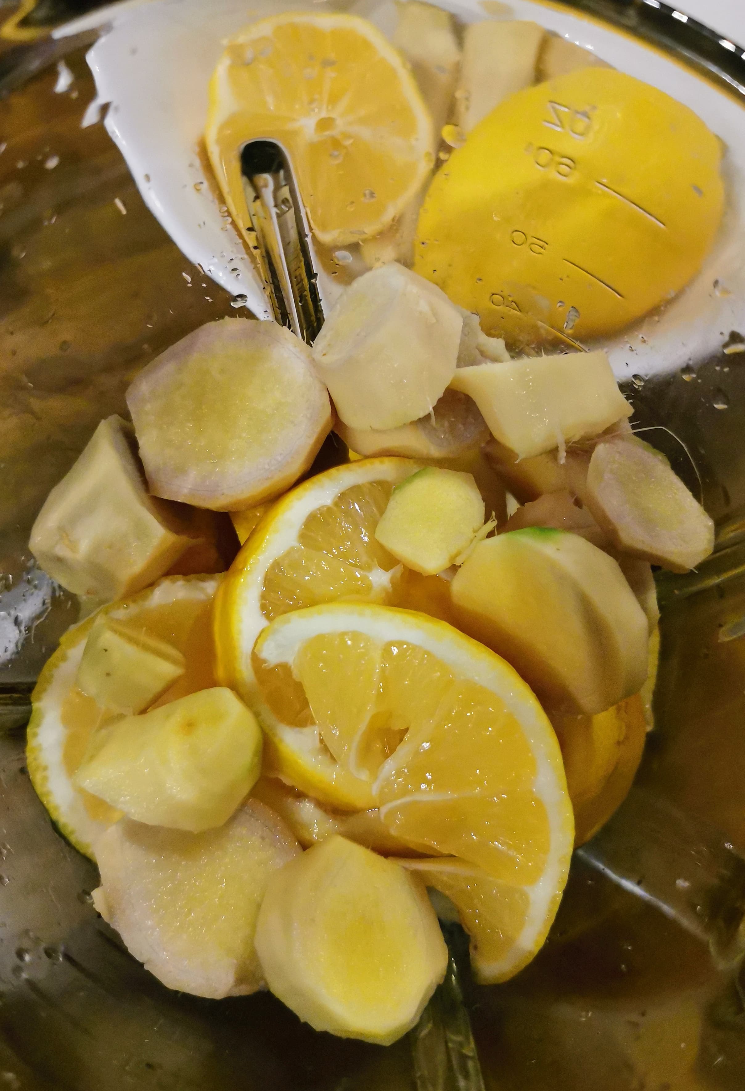 Для смеси мы почистили имбирь, порезали на части лимоны, вынули косточки. Засыпали в кувшин блендера.