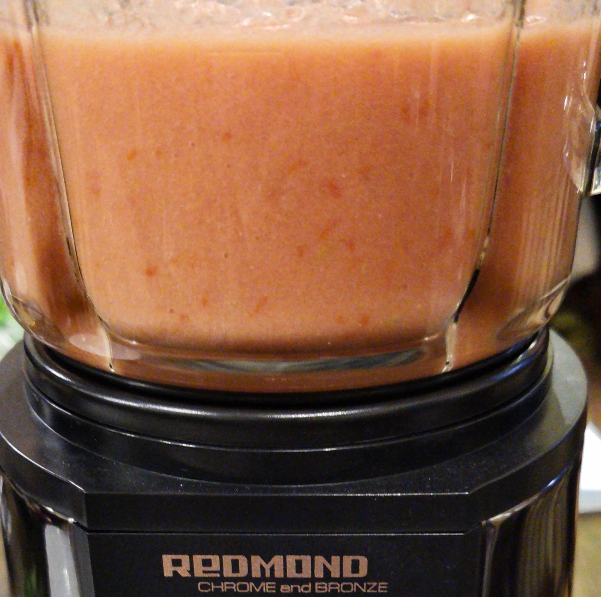 Весь объем томатов без дополнительной нарезки был засыпан в чашу. К нашему удивлению, никаких сложностей с подхватыванием ножами половинок не возникло, и через 30 секунд работы блендера в основном автоматическом режиме мы получили взбитую гомогенную массу с небольшими фрагментами кожуры и семян.