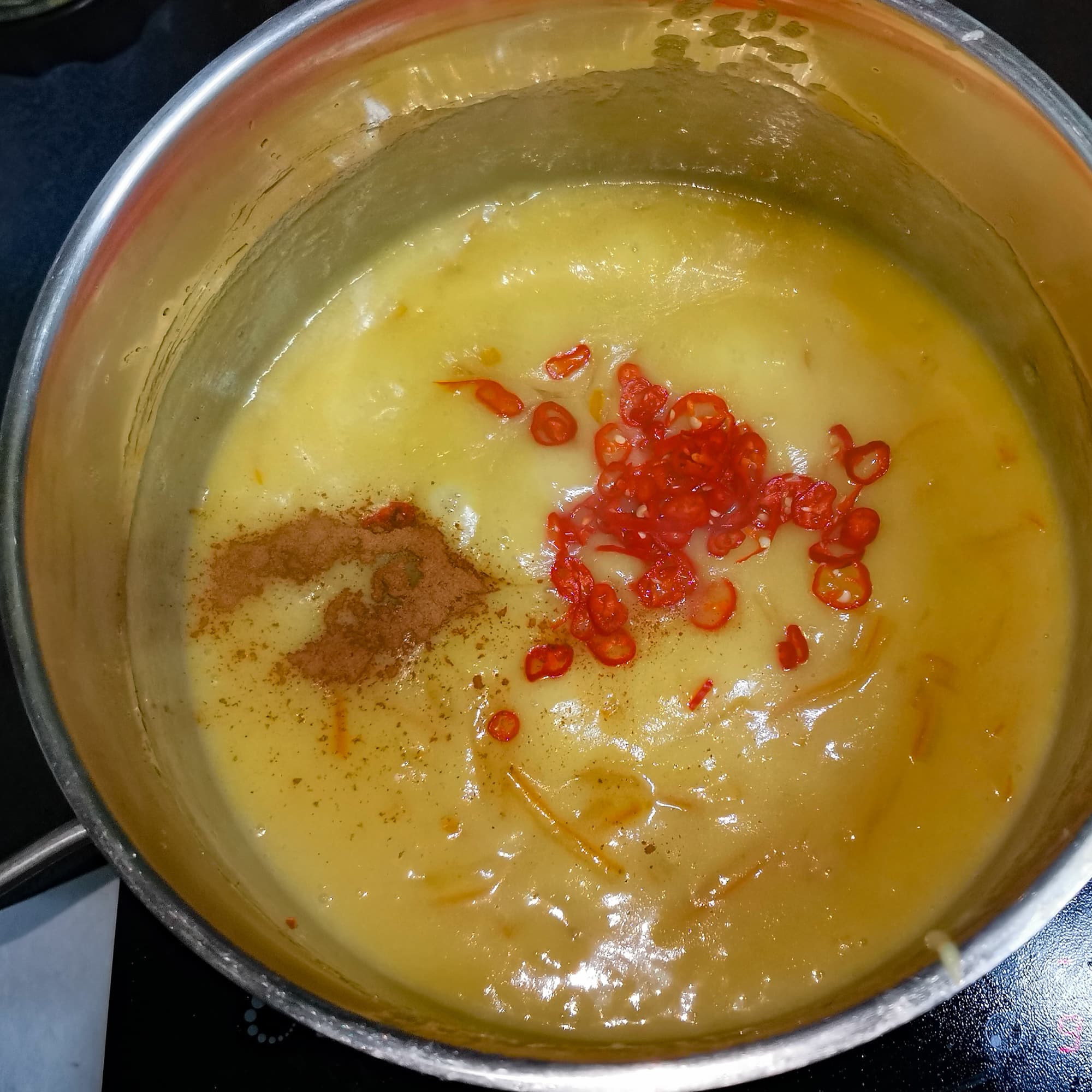 Отдельно сварили мелко нарезанные корочки в сахарном сиропе, добавили в них измельченные вареные апельсины, корицу, ваниль и острый перец.