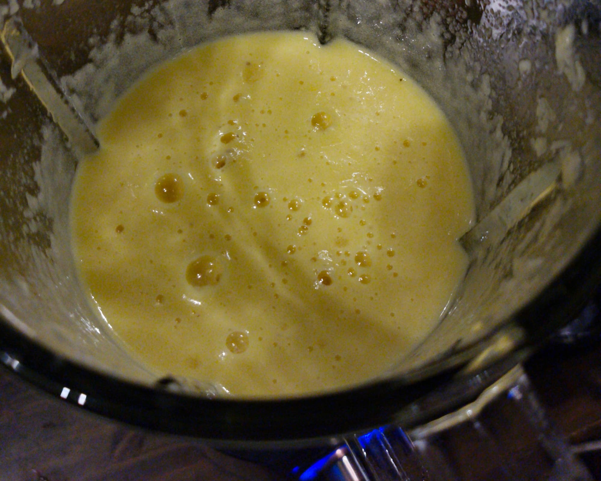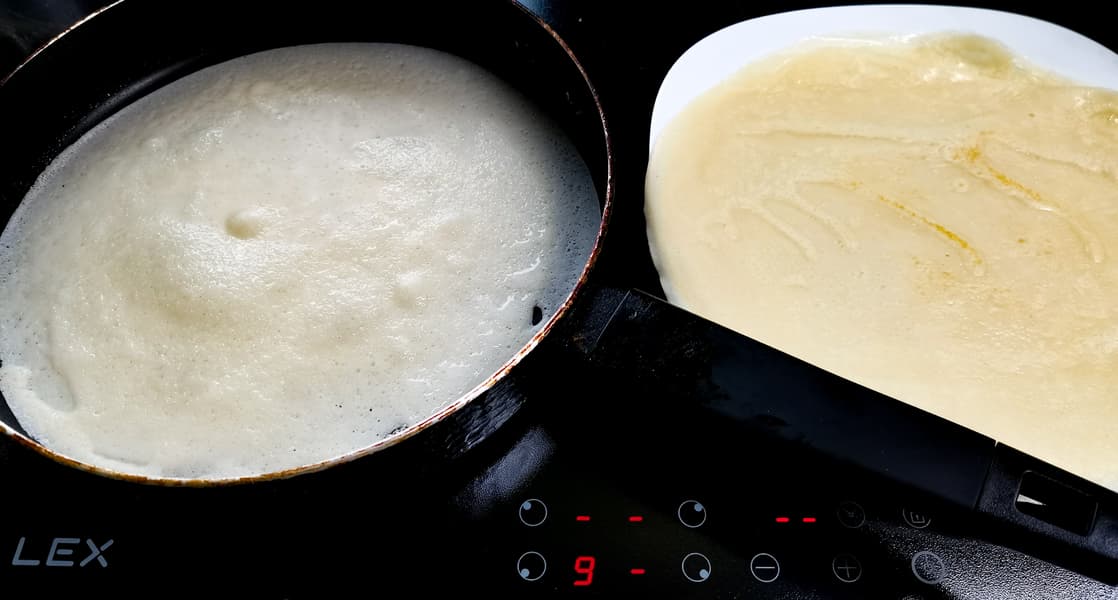 Тесто получилось воздушное, слегка взбитое, абсолютно однородное всего за пару минут. Выливать на сковородку можно прямо из кувшина, но аккуратно, так как носик для такой консистенции не очень удобный и тесто подливает и стекает по корпусу.
