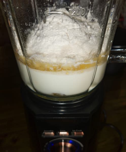 Для тонких блинов мы положили в кувшин блендера яйца, соль, сахар, налили молоко и насыпали муку. Установили кувшин на моторный отсек, включили основной режим. В процессе взбивания подливали воду, регулируя густоту теста.