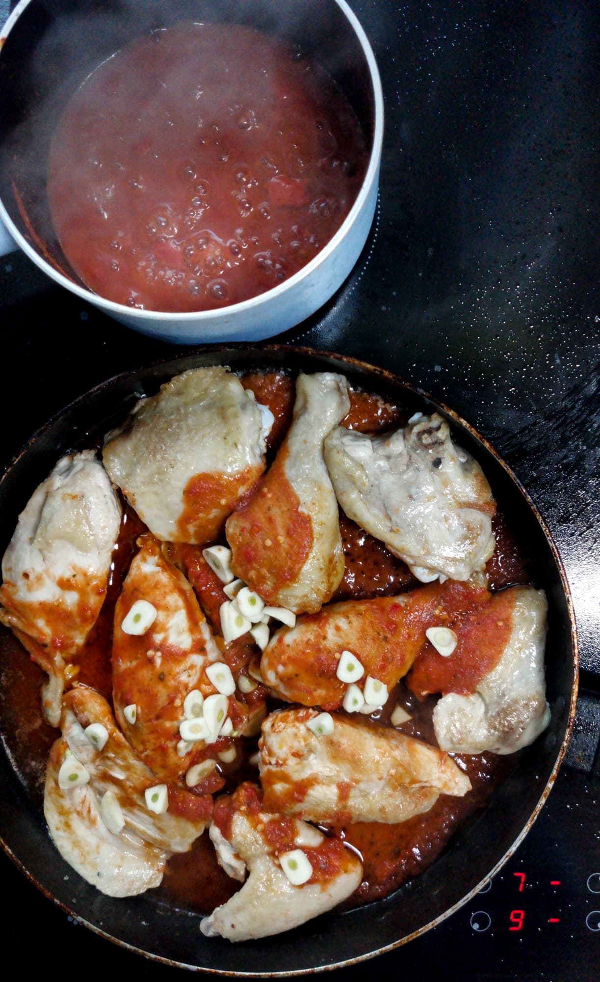 Из получившейся томатной массы мы сделали аджику, смешав ее в блендере с перцем и пряностями. Аджику сварили и использовали как заправку к курице.