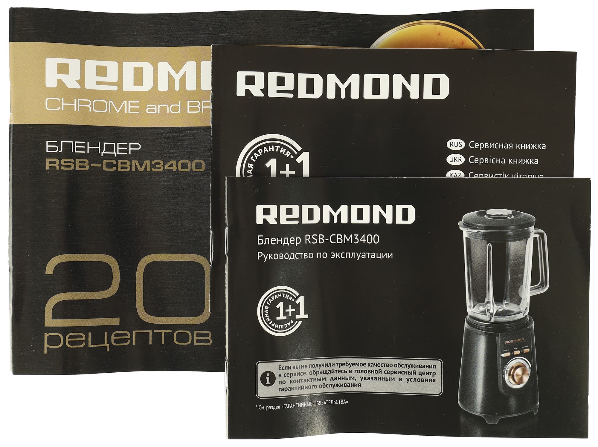 В комплекте с блендером Redmond RSB-CBM3400 идет руководство по эксплуатации, сервисная книжка и книга рецептов.