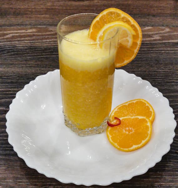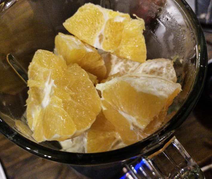Не разрезая и не разделяя фрукты на дольки, только порезав лимон на 4 части для того, чтобы вынуть косточки, мы загрузили полный кувшин. Измельчали сначала на импульсном, затем на основном режиме. В процессе добавили молотую корицу.