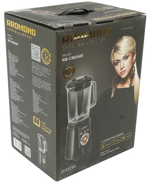 Блендер приехал к нам на тестирование в большой картонной коробке черного цвета. На коробке, как обычно у Redmond, женский портрет, фотография прибора и техническая информация.