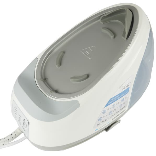 Подошва утюга с антипригарным керамическим покрытием имеет каплевидную форму с зауженной вершиной. Отверстия выхода пара расположены в один ряд вдоль боковых граней подошвы, с тремя отверстиями в вершине.