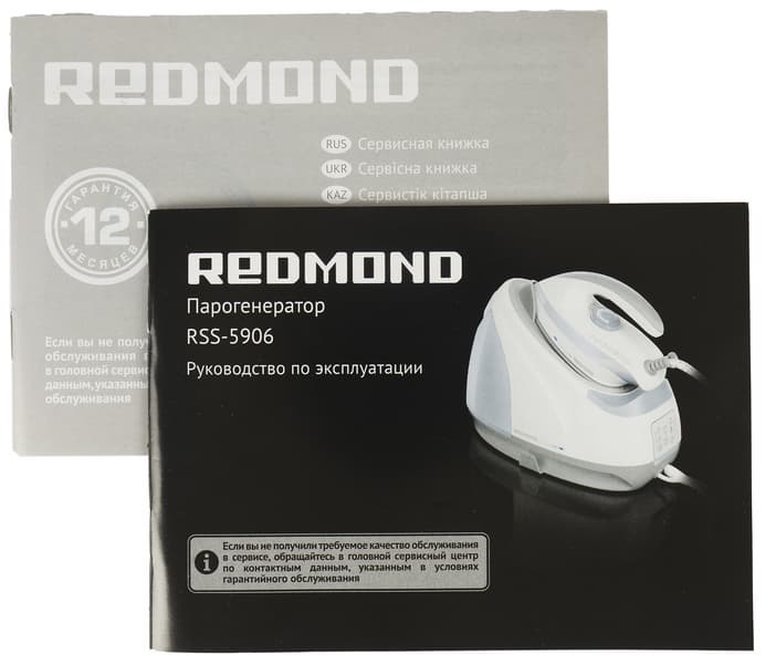 В комплект Redmond RSS-5906 входит паровая станция с присоединенным к ней утюгом и сопроводительная документация в виде инструкции и гарантийного талона.