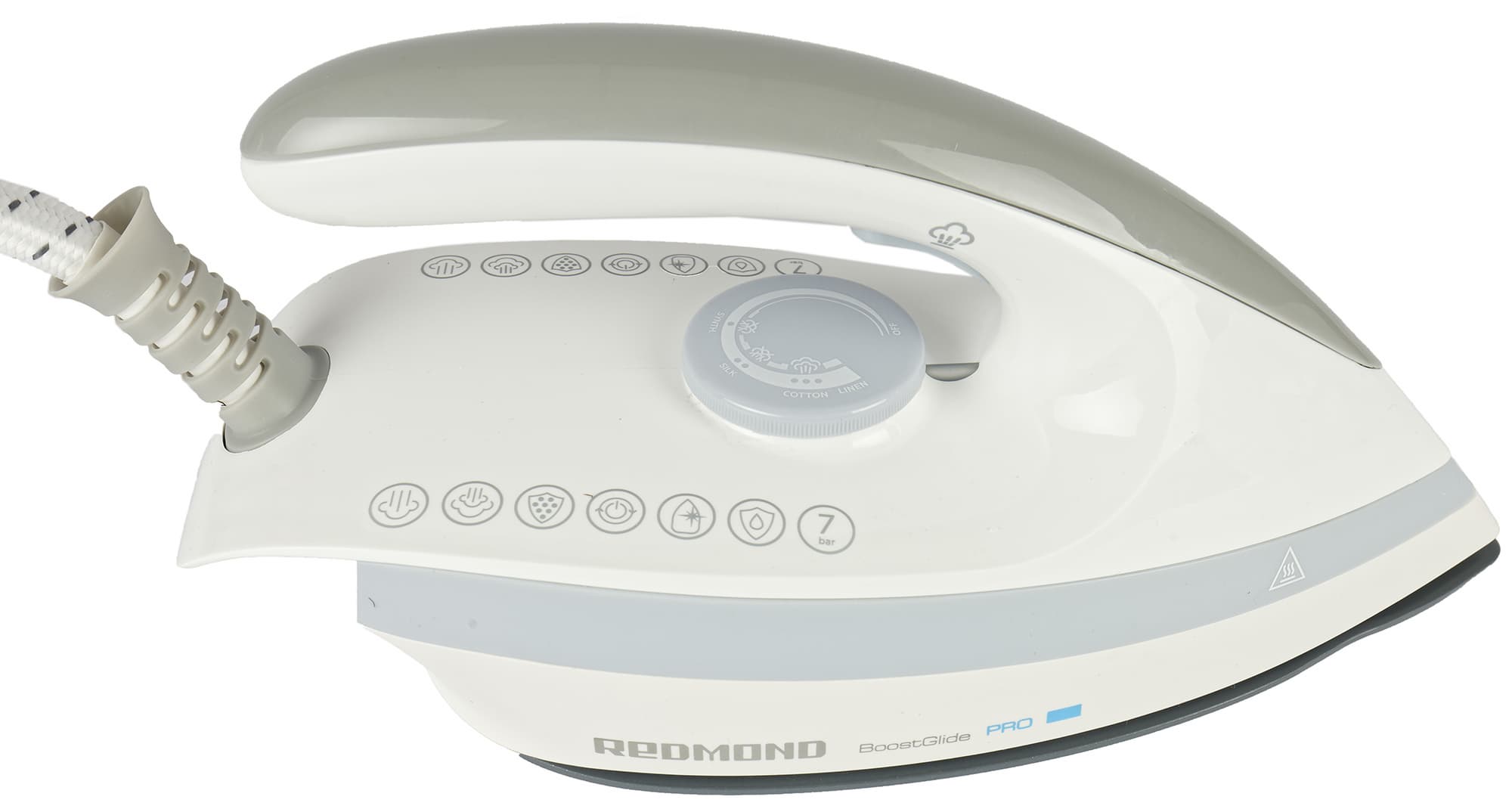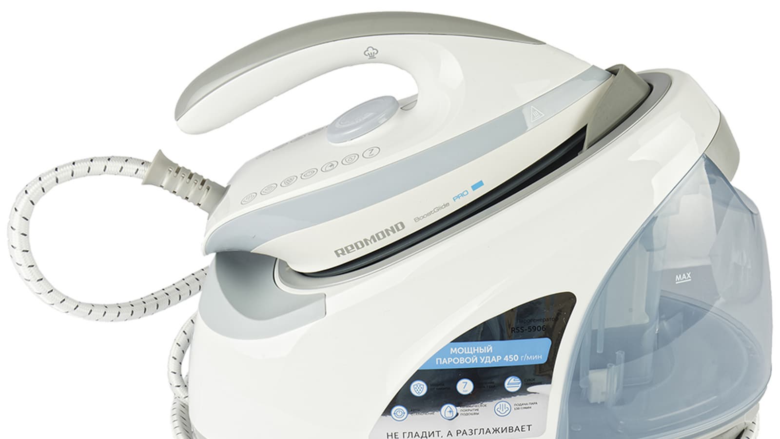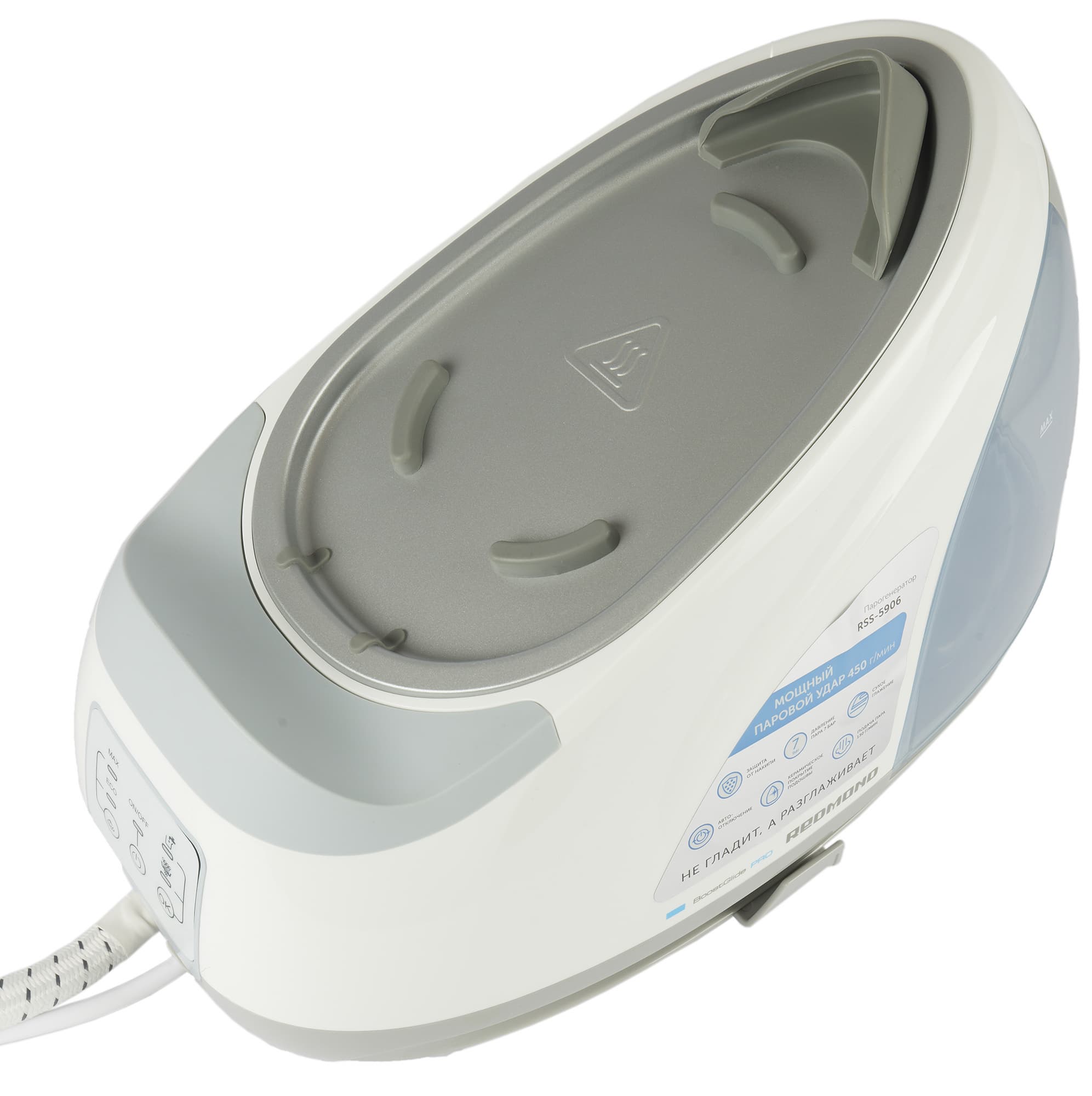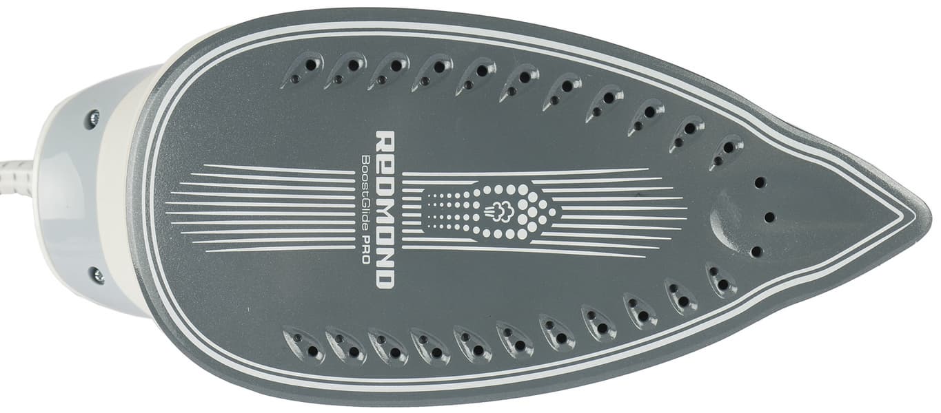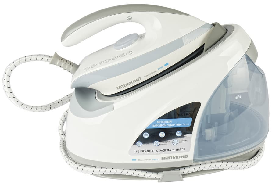 Redmond RSS-5906 подходит как для сухого глажения, так и для глажения с отпариванием. Короткий выброс пара происходит путем нажатия на кнопку с внутренней стороны ручки утюга.