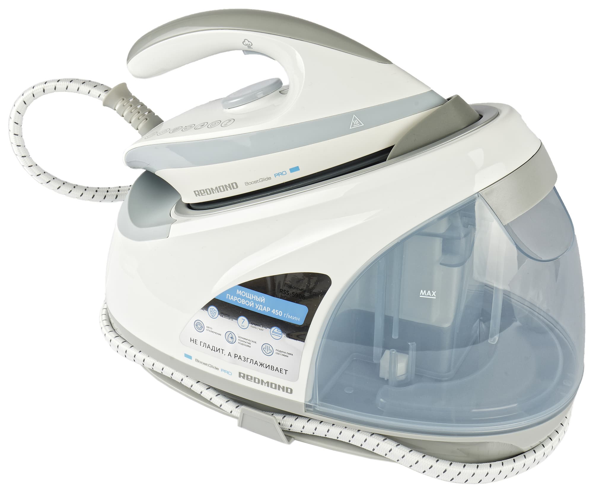 Бойлерный парогенератор Redmond RSS-5906 мощностью 2400 Вт оснащен режимом постоянной подачи пара в 130 г/мин и функцией парового удара в 450 г/мин для мгновенного смягчения и распрямления волокон трудно поддающихся глажке сильно измятых тканей.