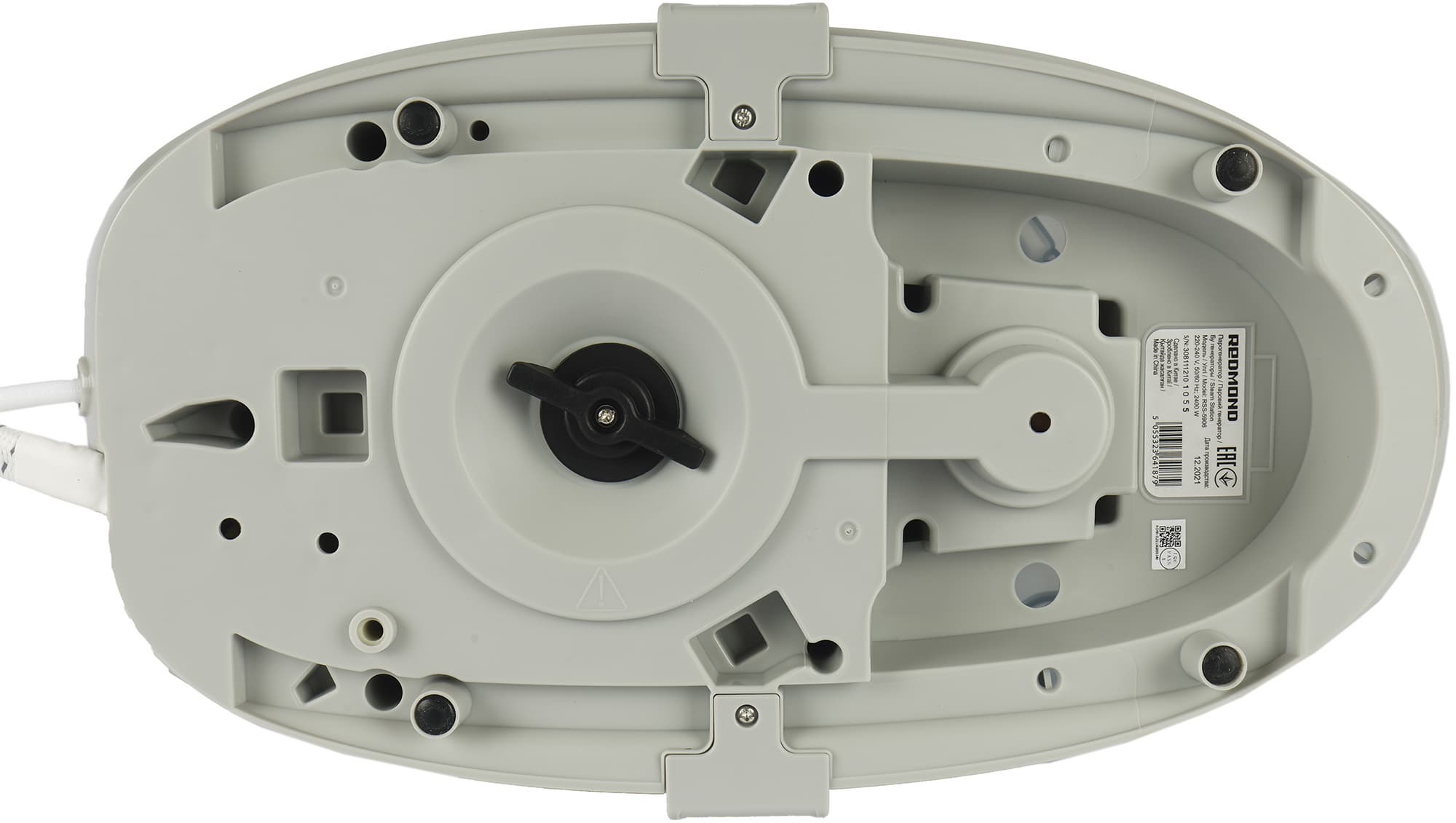 На дне базы мы видим: 4 прорезиненные ножки, наклейку с технической информацией и клапан, откручивание которого позволит слить воду в процессе очистки прибора от накипи.