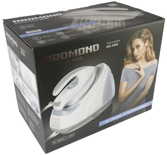 Парогенератор прибыл к нам упакованным в красивую коробку с приятным сдержанным дизайном в фирменной стилистике Redmond. На упаковке размещены фотографии самого устройства, технические характеристики, а также описание его ключевых особенностей.
