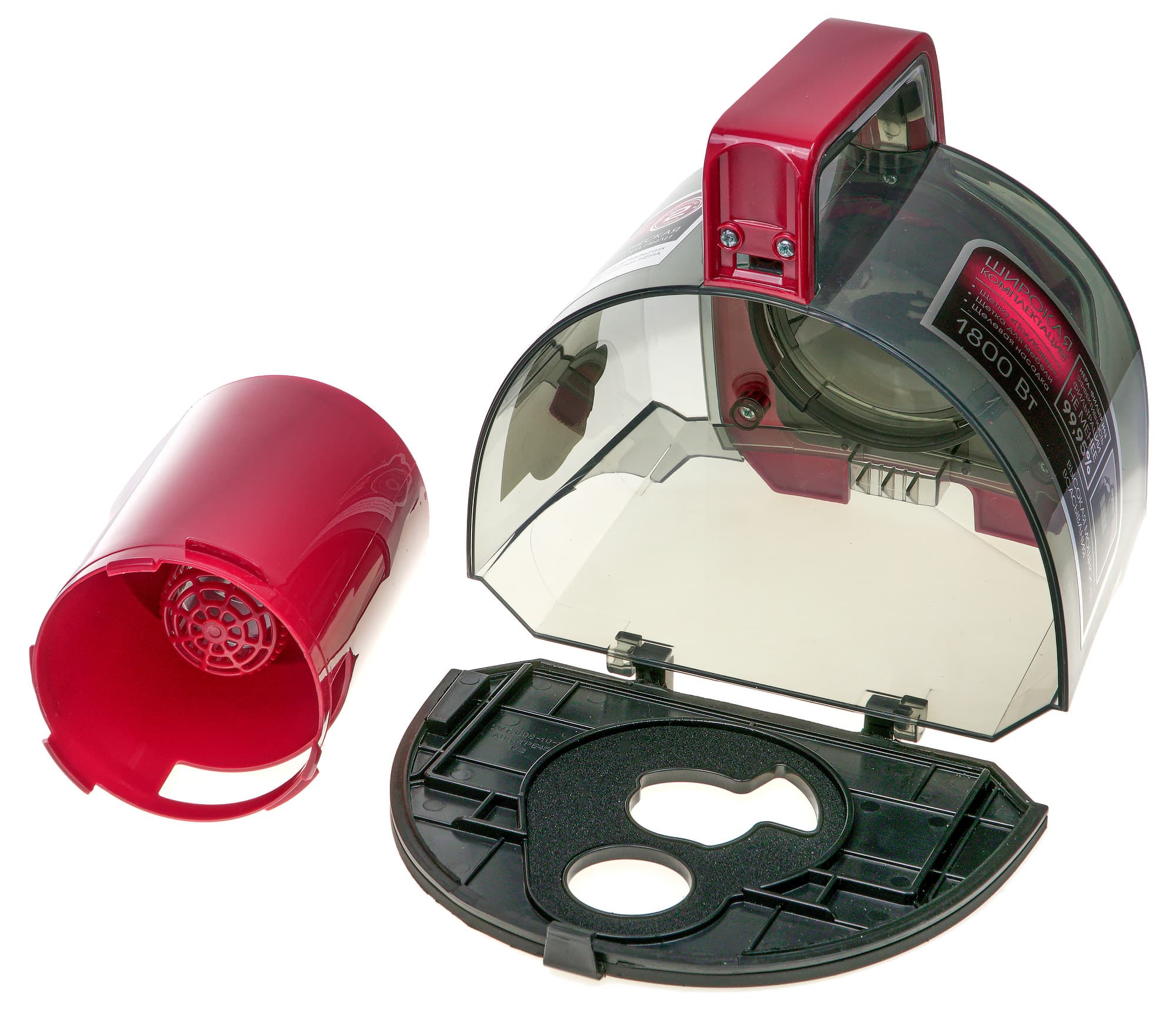 Переднюю часть корпуса занимает объемный мусоросборник из полупрозрачного сероватого пластика, снабженный ручкой для извлечения и кнопкой открывания крышки.