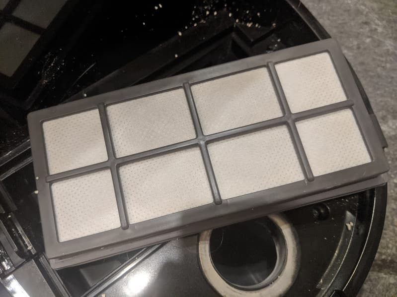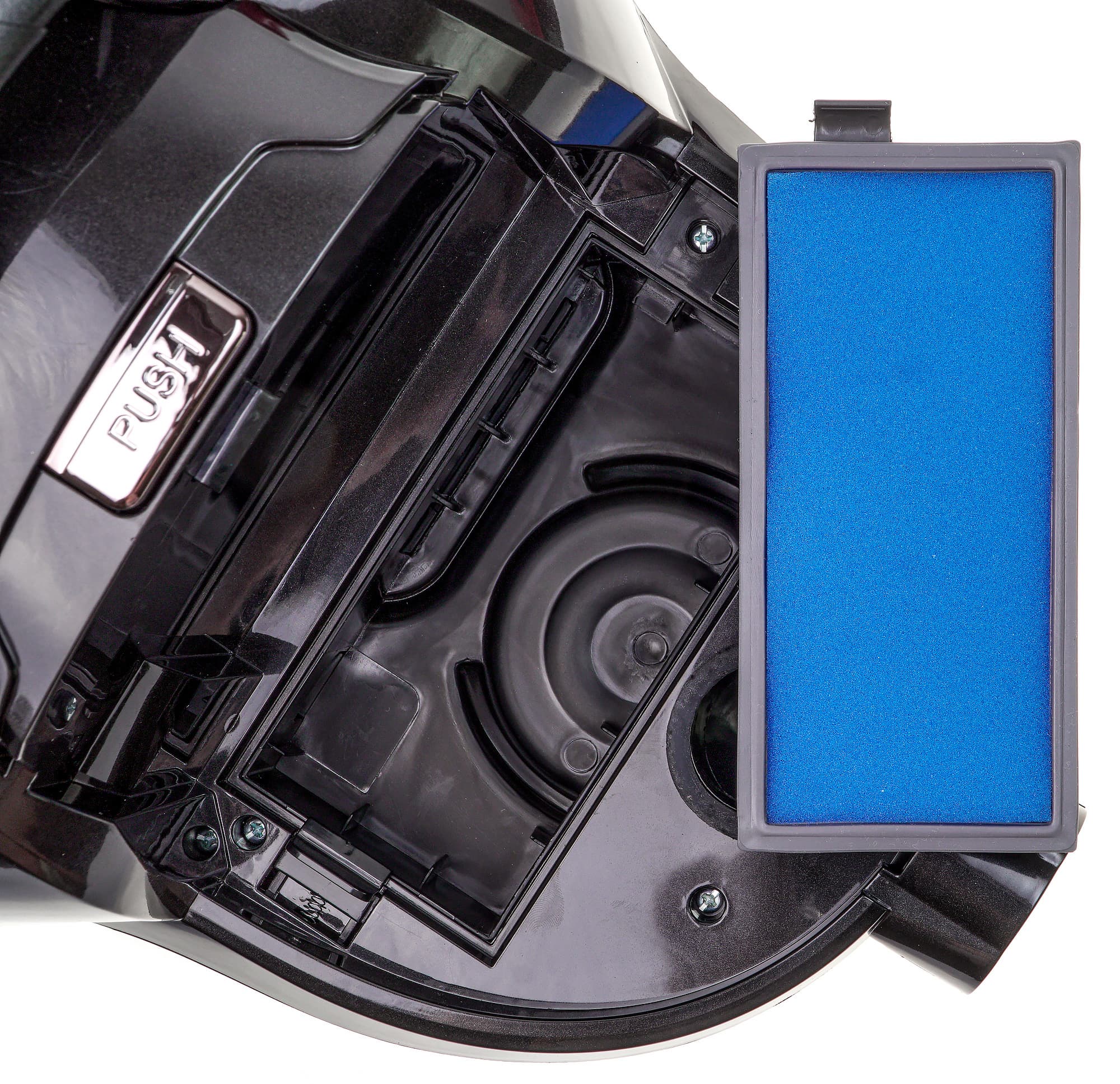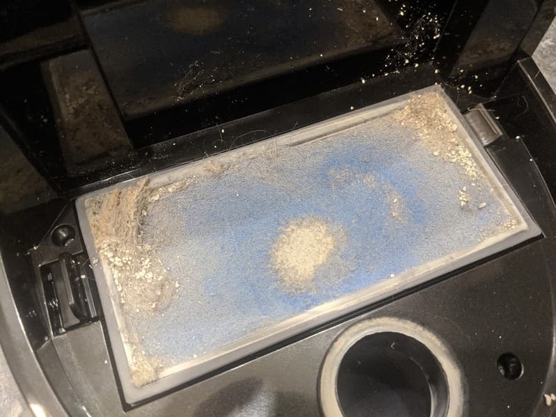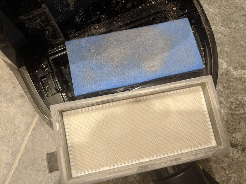 Последний закреплен в корпусе под мусоросборником, имеет прямоугольную форму и состоит из двух слоёв: более крупная пыль оседает на поролоновой губке голубого цвета, за ней же расположен плоский фильтр из нетканого материала.