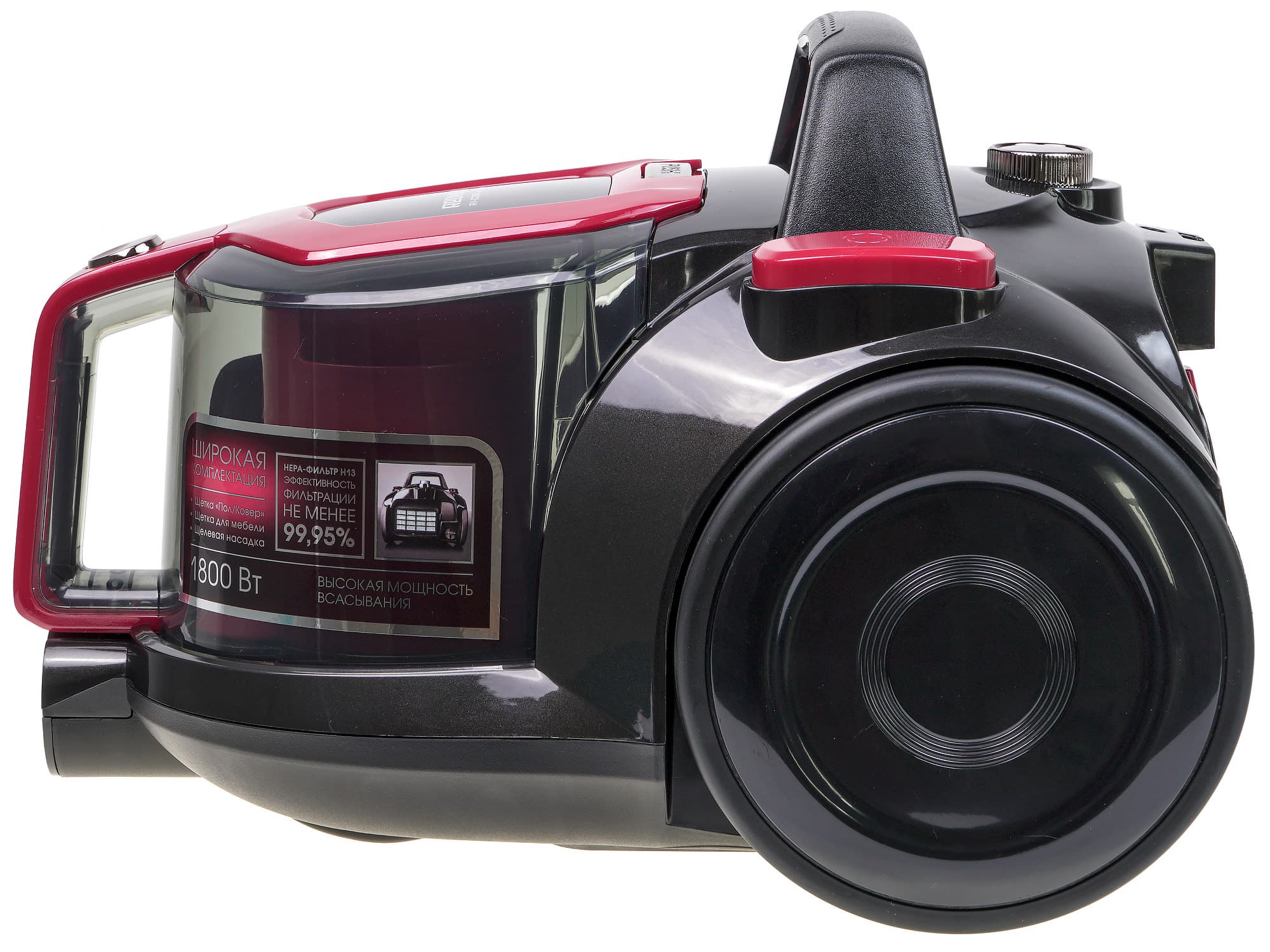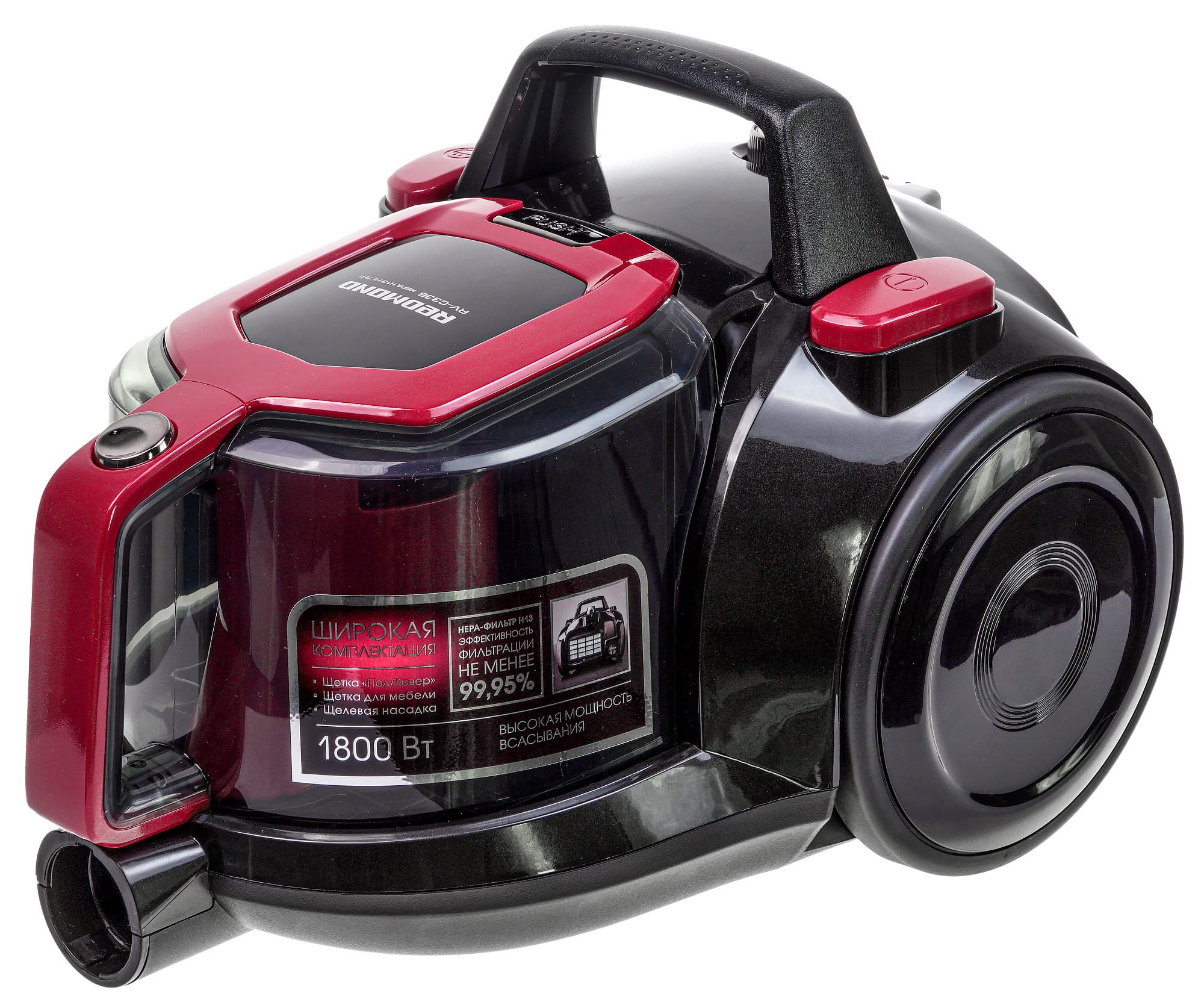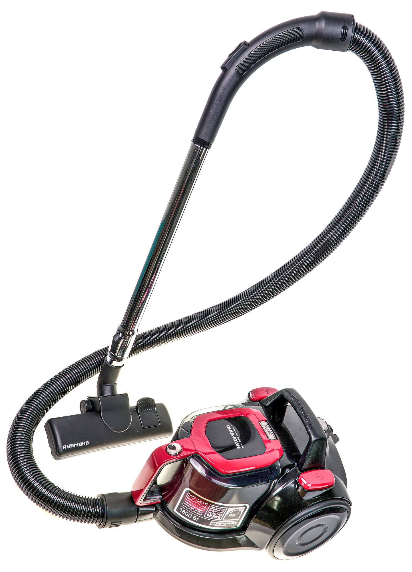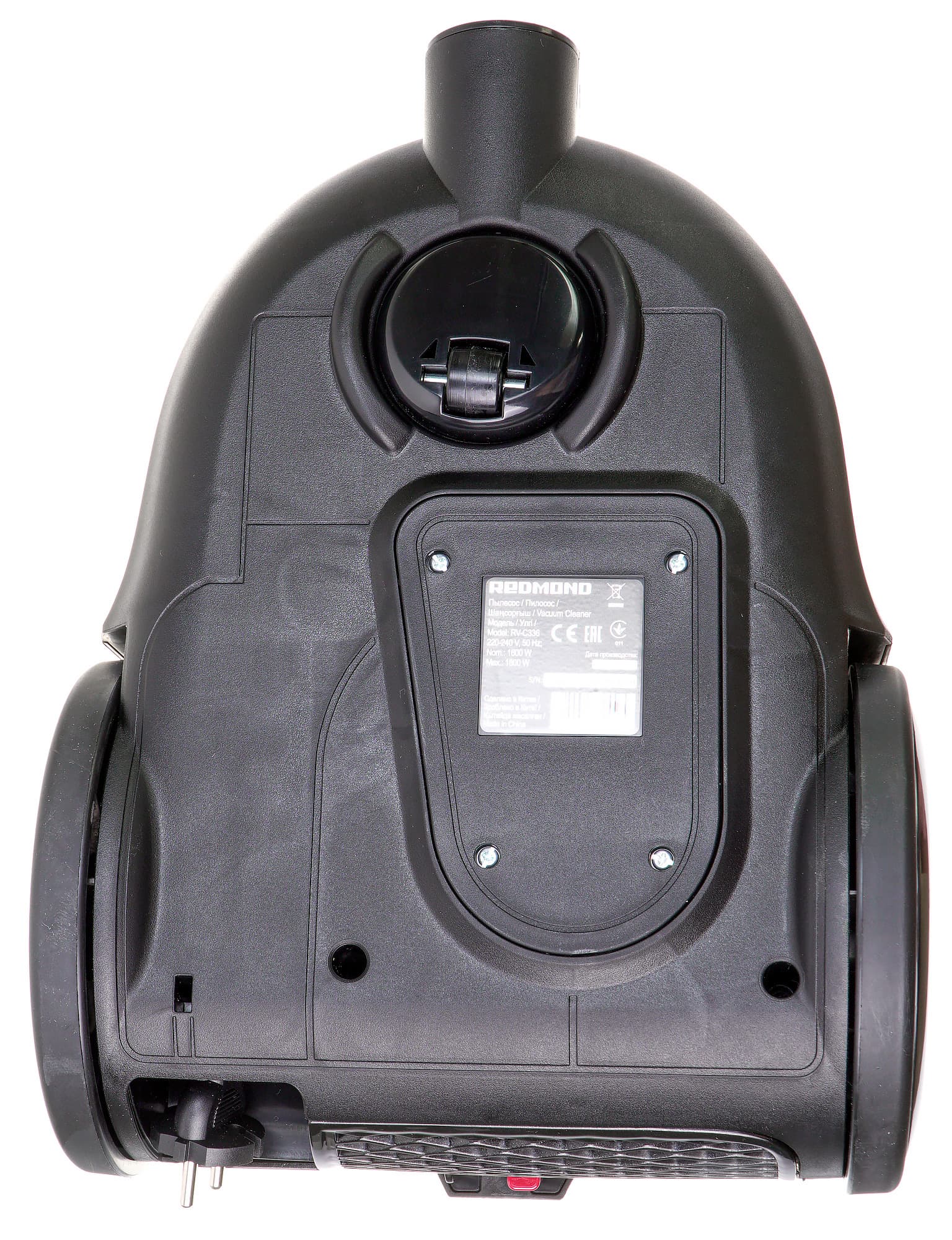 Redmond RV-C336 — типичный малогабаритный напольный пылесос традиционной конструкции. Его корпус сделан из глянцевого черного пластика с декоративными элементами ярко-красного цвета.